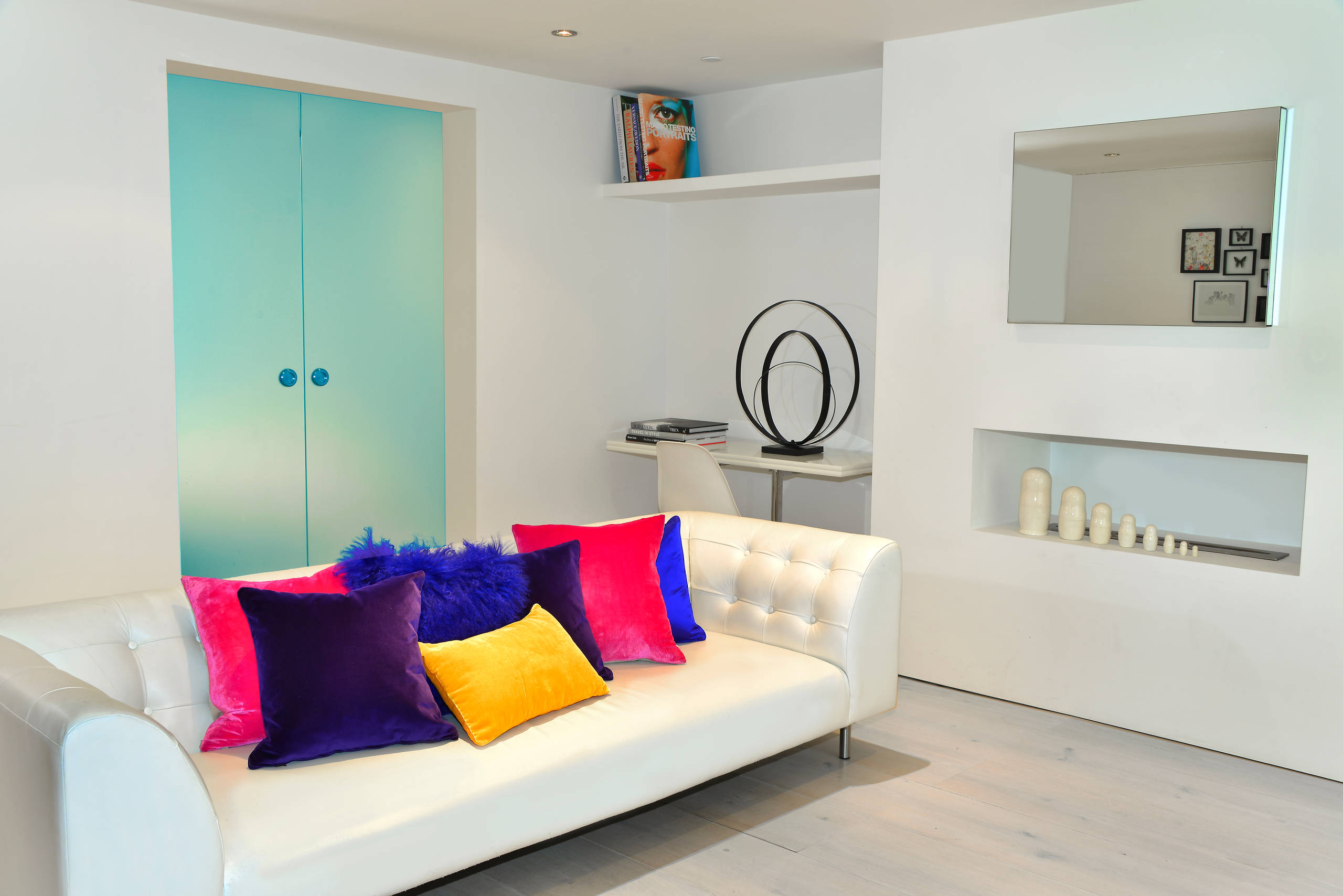 An easy way to start you on your jewel-tone journey is with some cushions. A mix of amethyst, sapphire, ruby and gold velvets brings this minimalist white interior to life.