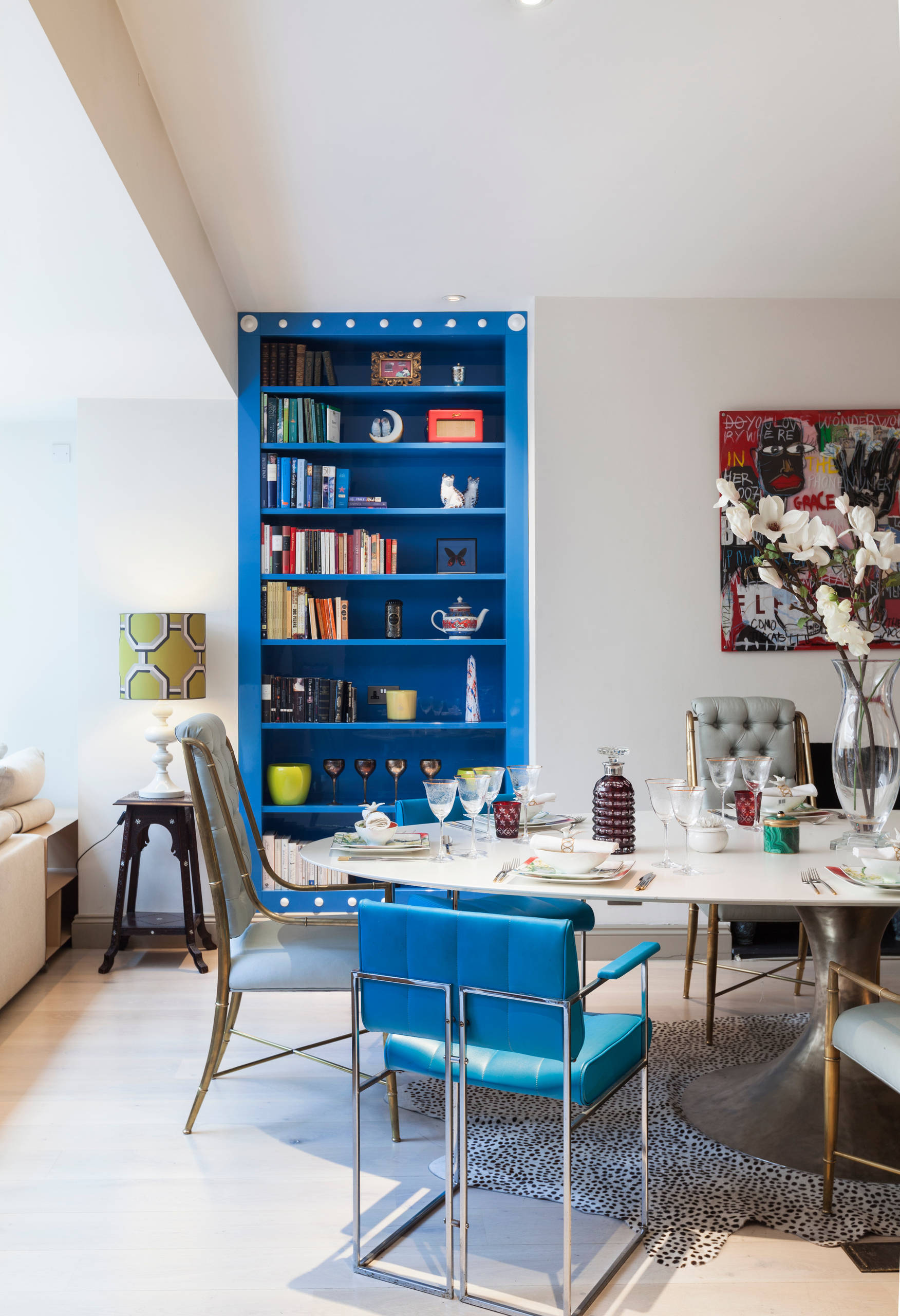 Update an old piece of furniture or an area of shelving with a lick of bright paint. It will give new life to the item or zone, and add a focal point to the room. The sapphire bookcase here looks striking and works well with the glass and metallic elements elsewhere in the scheme.