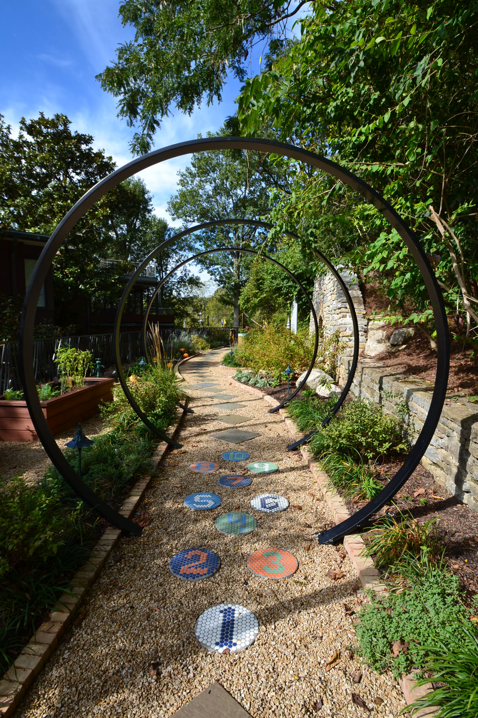 You can create large designs on walls and patios, or go for something smaller. The numbered stepping stones along this path would be simple to make, but look fun and will provide the basis for a whole host of games.