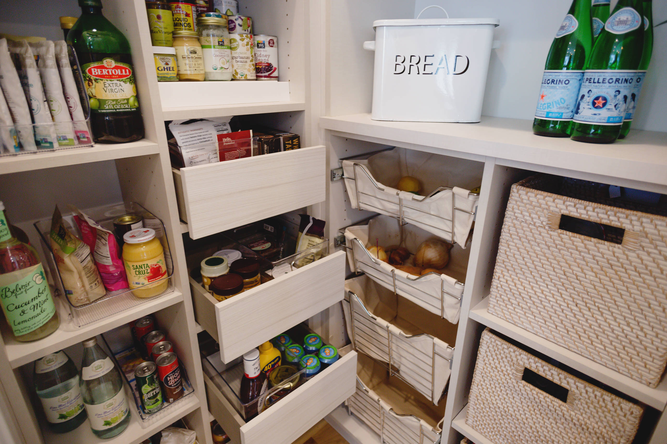 Deep cabinets in the pantry are bound to become a cluttered mess. Install pull-out baskets, drawers and shelves and you’ll be able to easily reach what you need, even if it’s right at the back.