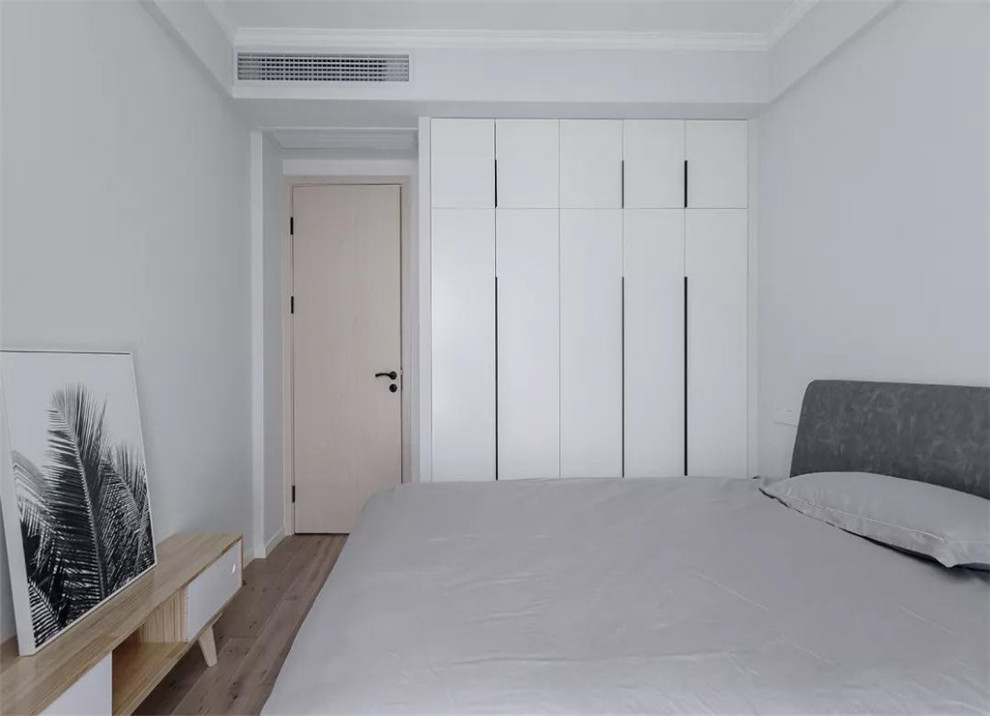 In this serene space, the team at Dolphin Craft have built a wardrobe with slimline doors and smaller cupboards at ceiling level to maximise organisation. It’s been designed to blend into the architecture of the room, and the pale colour and discreet handles help what is a large piece of furniture to recede.