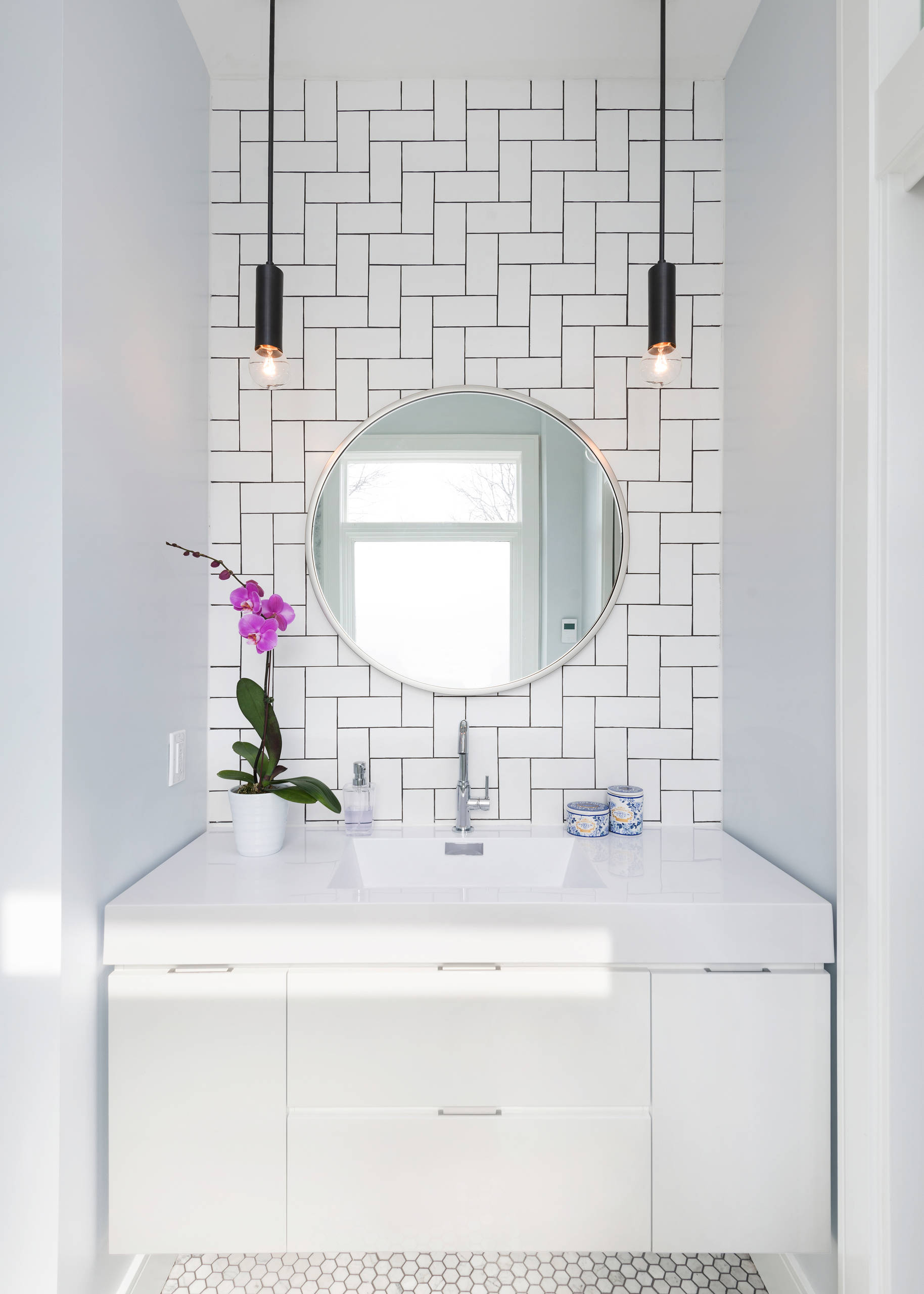 Rather than going floor-to-ceiling wallpaper, consider papering above a wall of white tiles or tongue-and-groove panelling. Here, the white tiles provide contrast against the dark wallpaper, and also protect the bottom half of the walls. This approach will also make the papered area easier to change if you want to retreat back to the safety of plain walls.