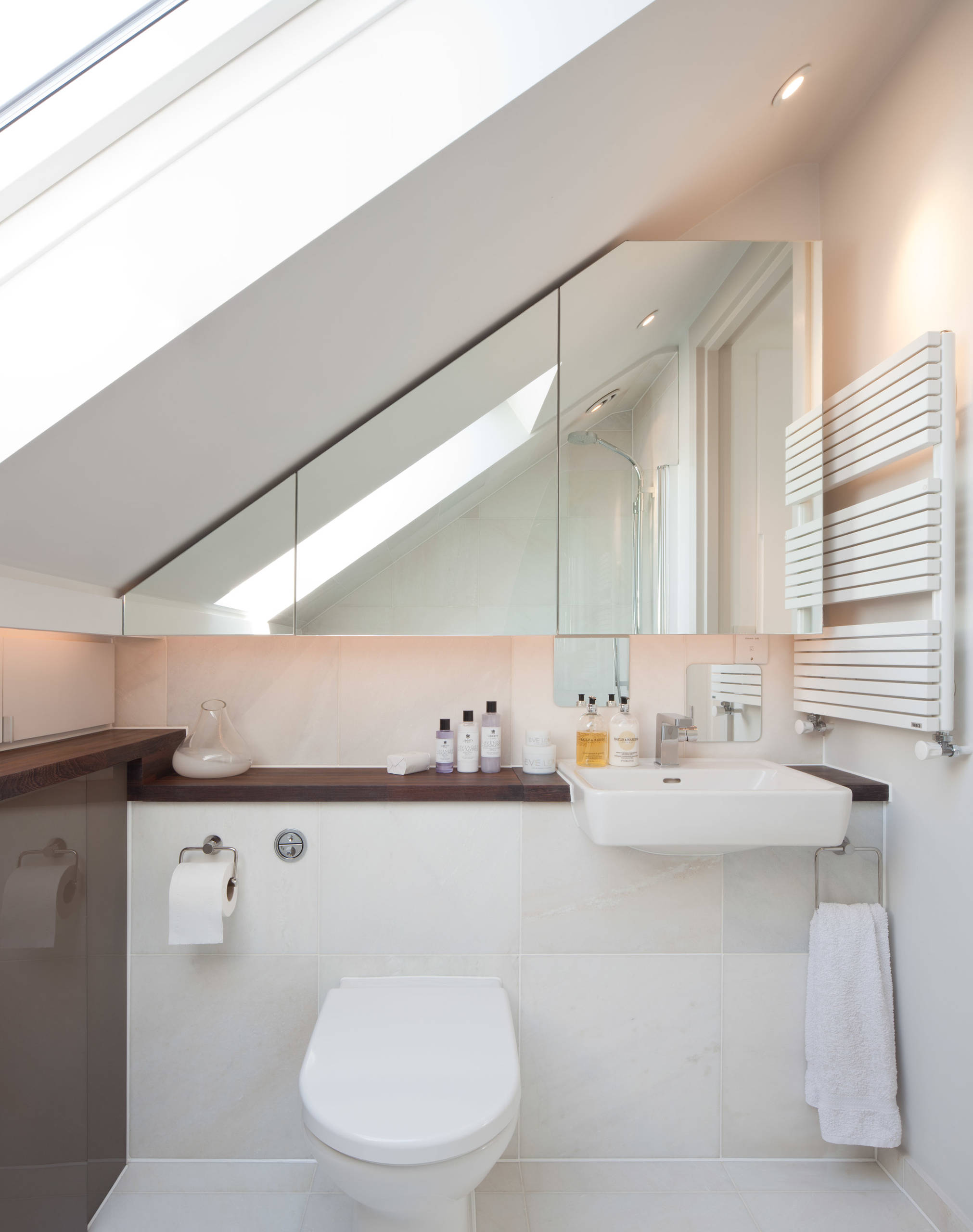 “Any loft conversion will involve structural alterations of some form or other, so embrace idiosyncrasy,” Angus advises. “Expose structure and use it as a feature to add some personality to the space. Work with, not against, a sloping ceiling, and use ‘dead’ space to conceal the cistern for a wall-hung toilet.”