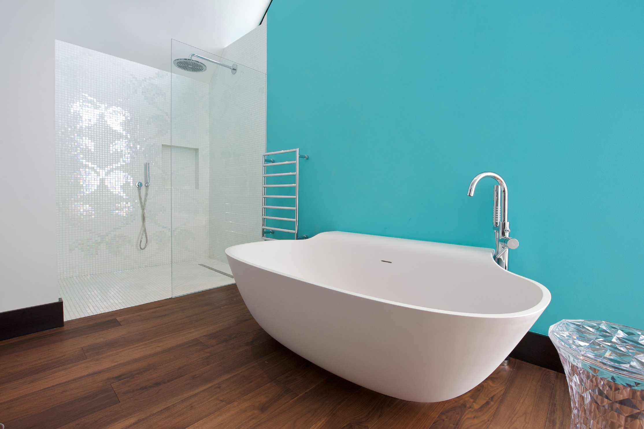 A high-impact hue makes the perfect backdrop for a statement tub. Blues and greens work particularly well in the bathroom. Just lie back and imagine you’re floating in a tropical sea, gazing at a cloudless sky. Pure bliss.