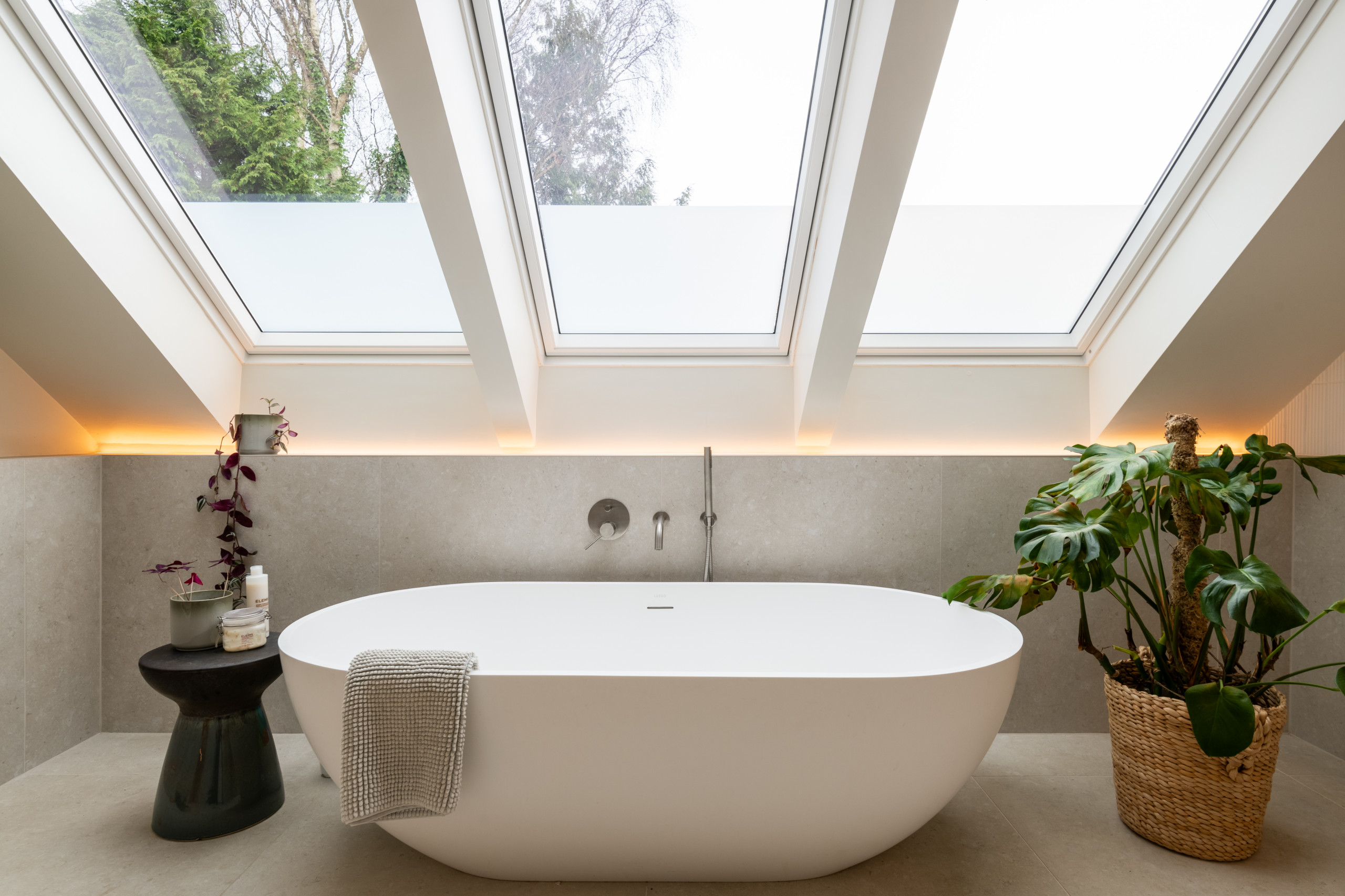 The room also has a freestanding bath, which sits beneath a trio of skylights, maximising the potential for bathtime relaxation.