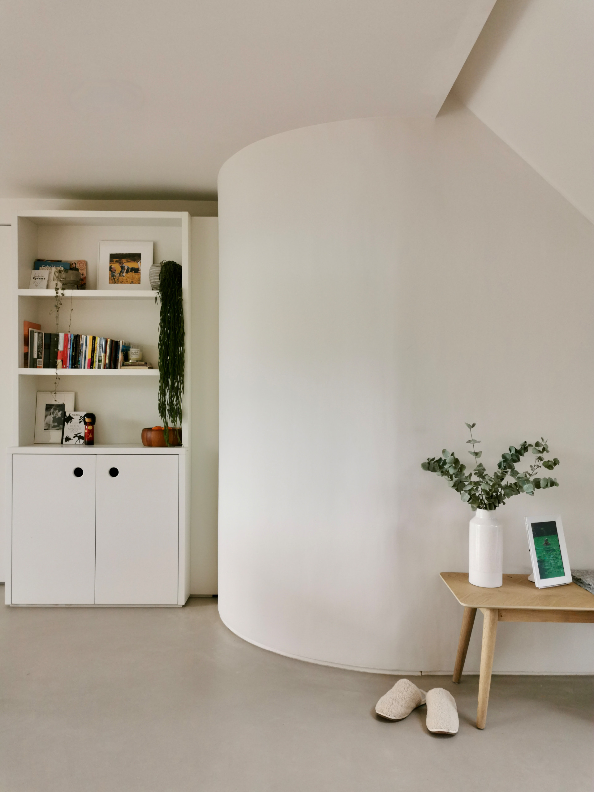 There’s another significant curve on the opposite side of the open-plan room, where Karen designed this bench in the lounge area. Its radius matches exactly that of the curved wall, which is diagonally opposite.
