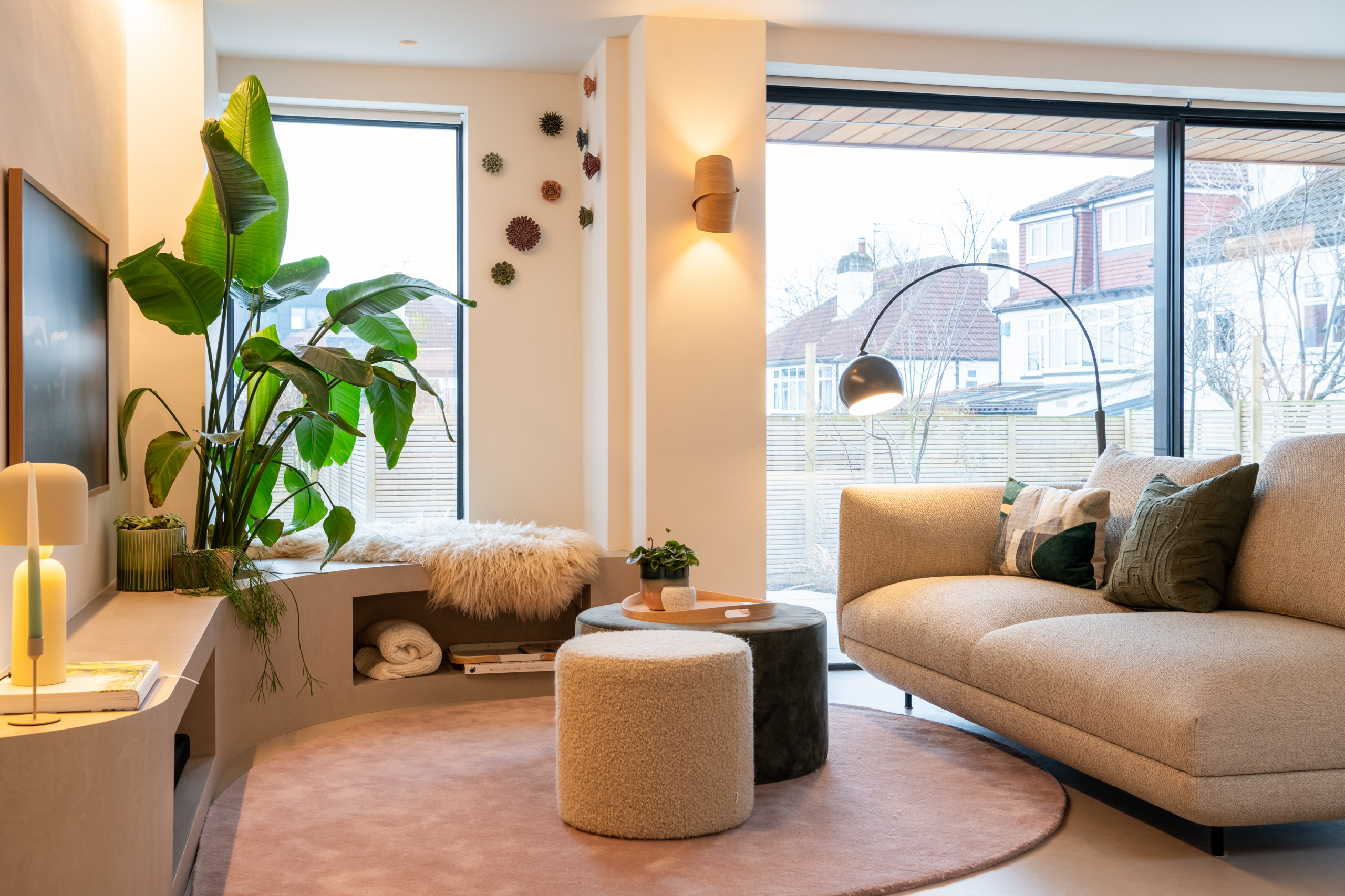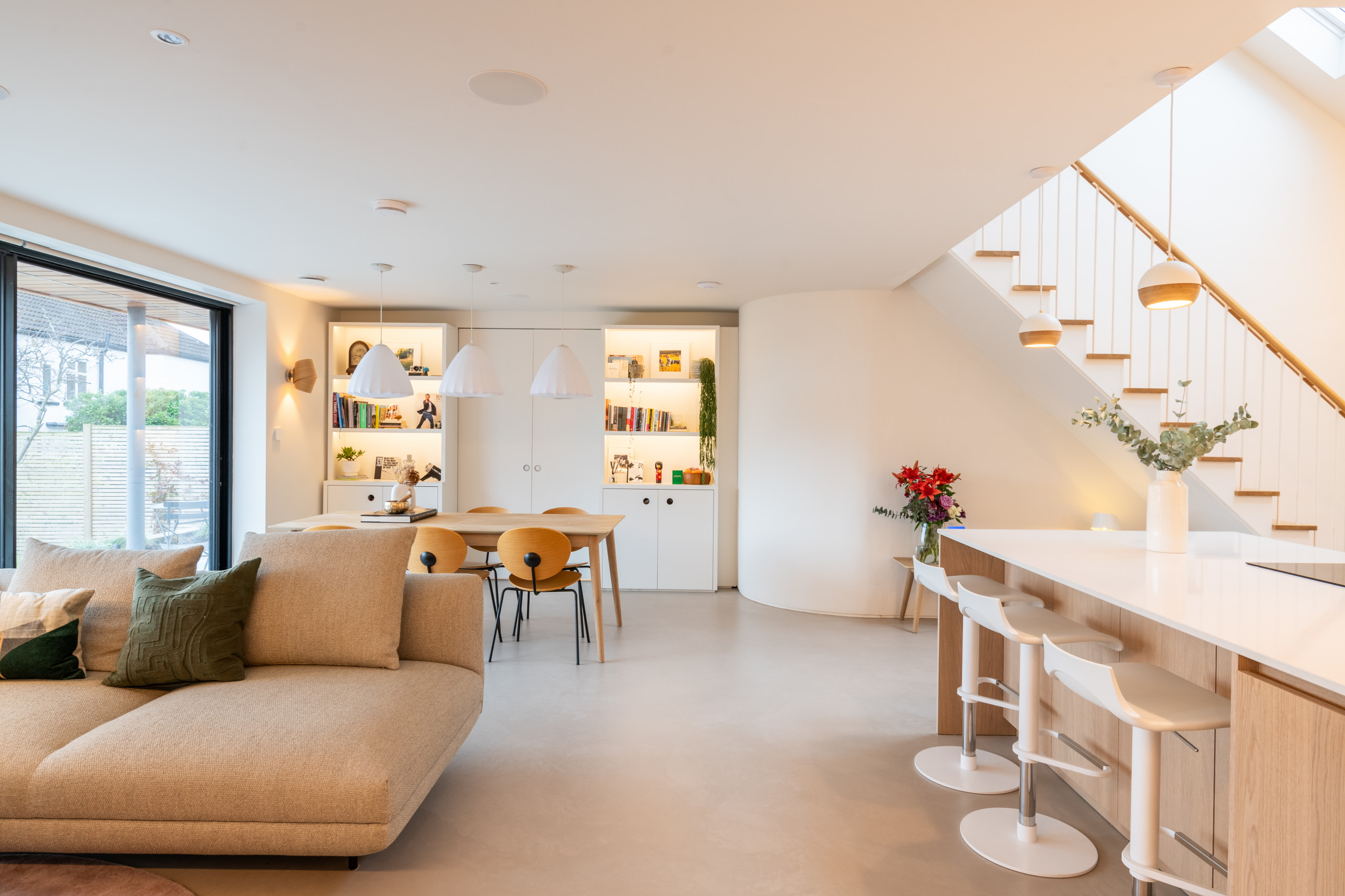 On the right, behind large blinds – colour-matched to blend in with the walls – are sliding doors opening onto the front garden.