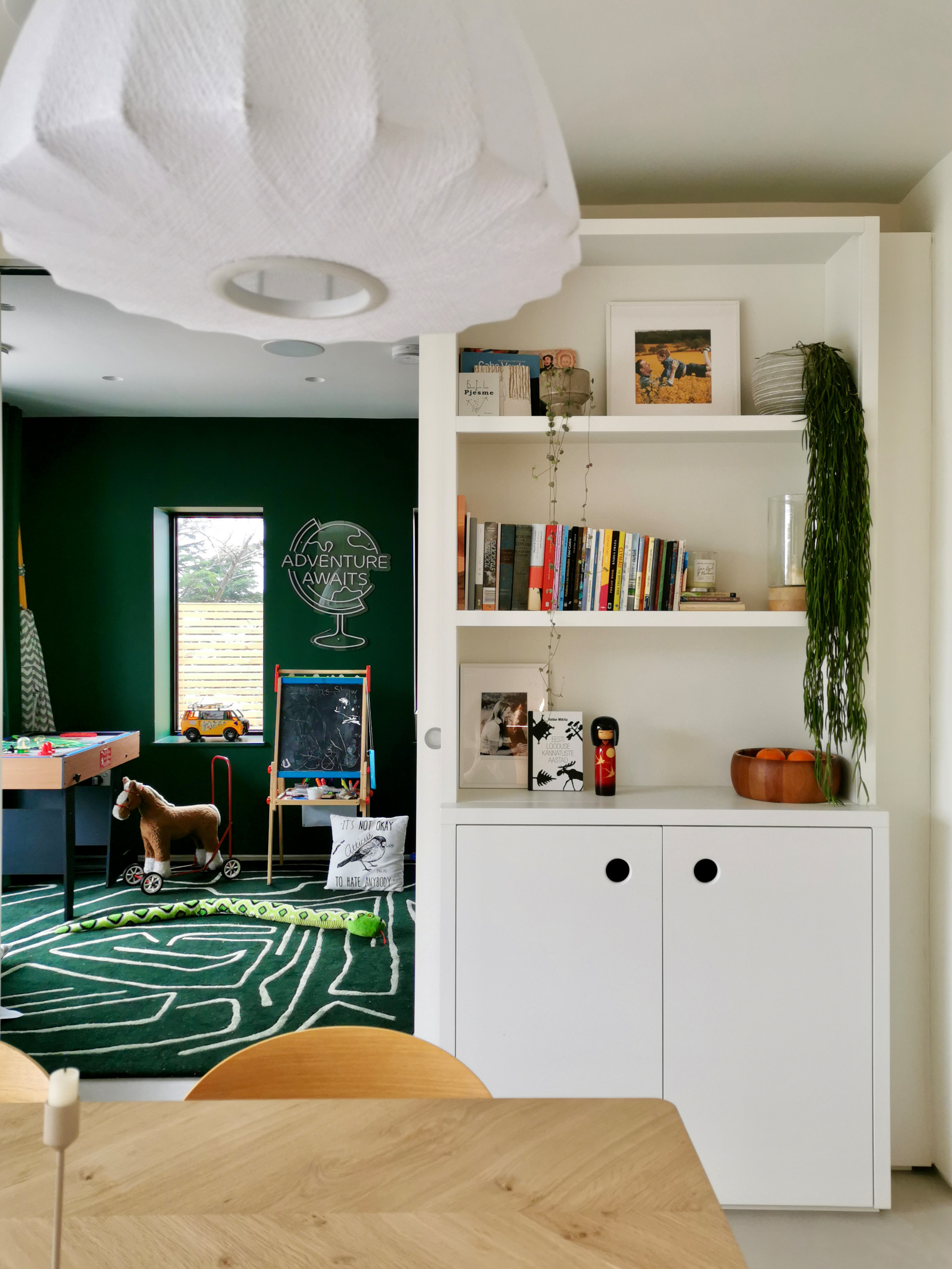 Behind the dining table is a pair of pocket doors, which hide a play area for the couple’s son. “I wanted a complete contrast and a strong colour for in here, and green was the obvious choice,” Karen says.