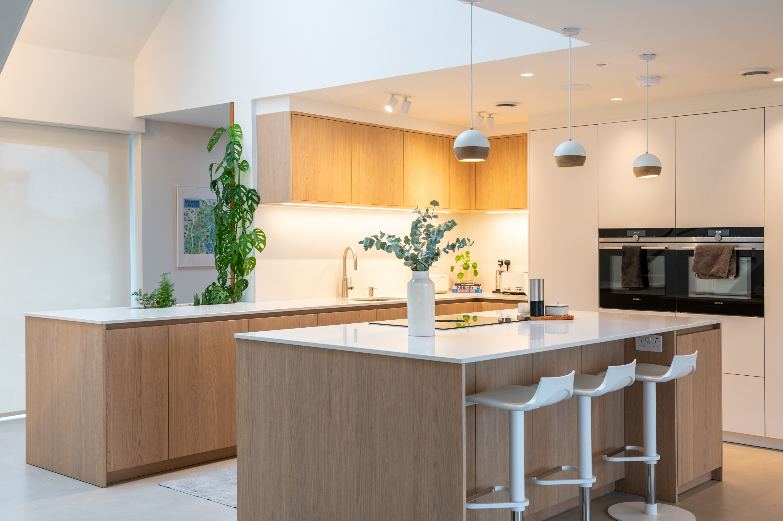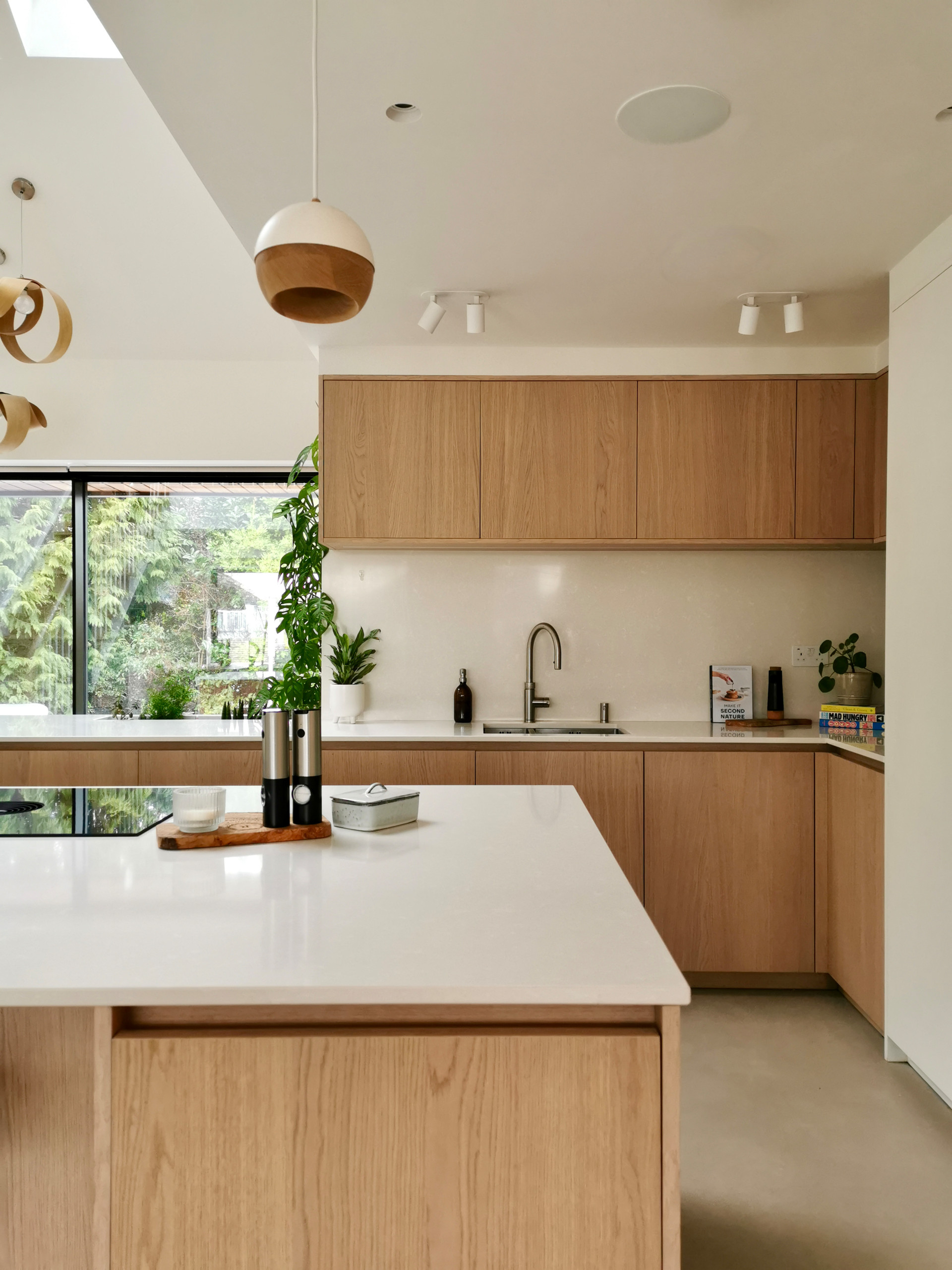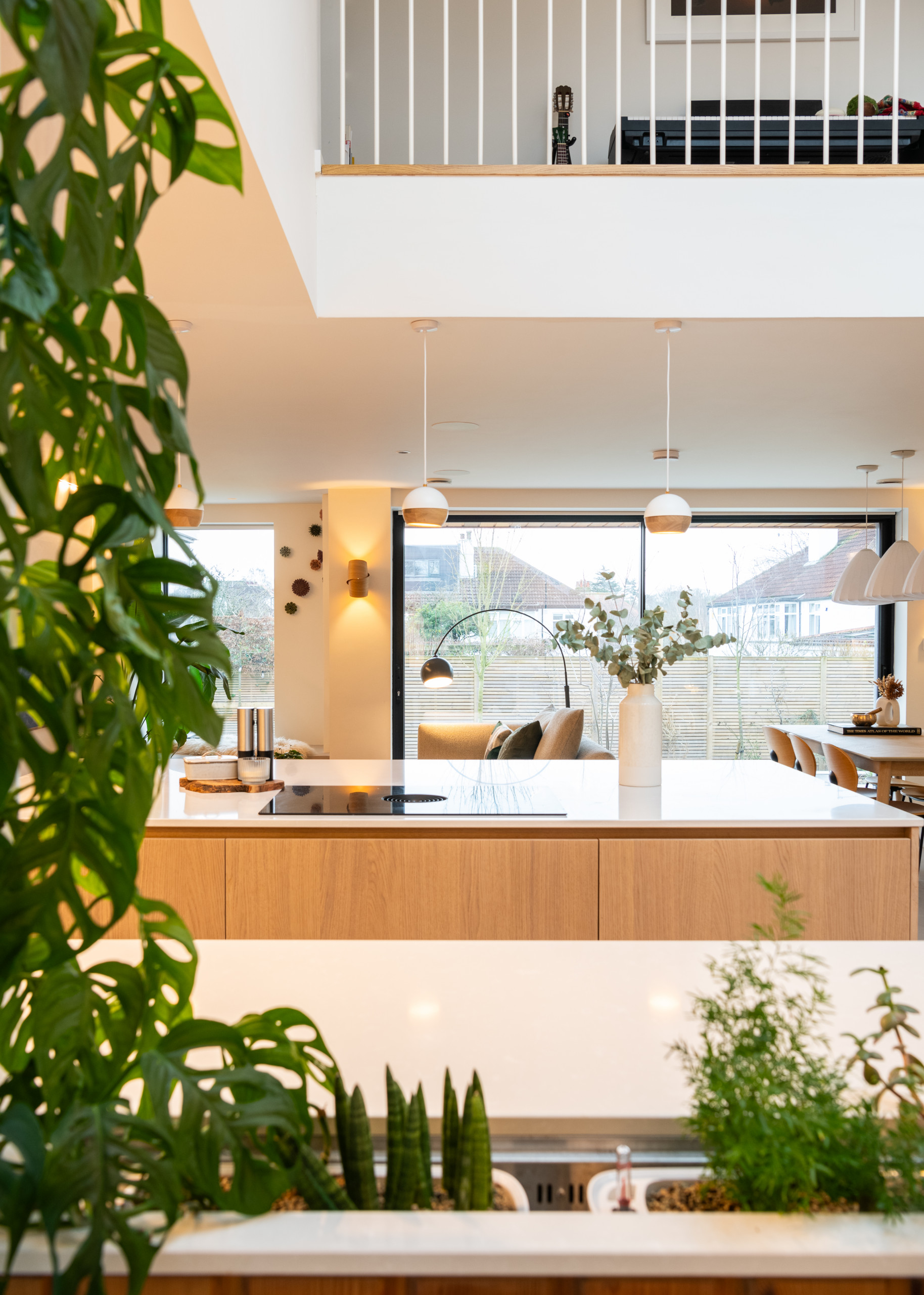 At the centre of the L-shaped kitchen there’s a large island with an induction hob and downdraft extractor. The sink is tucked away, just beyond the greenery.