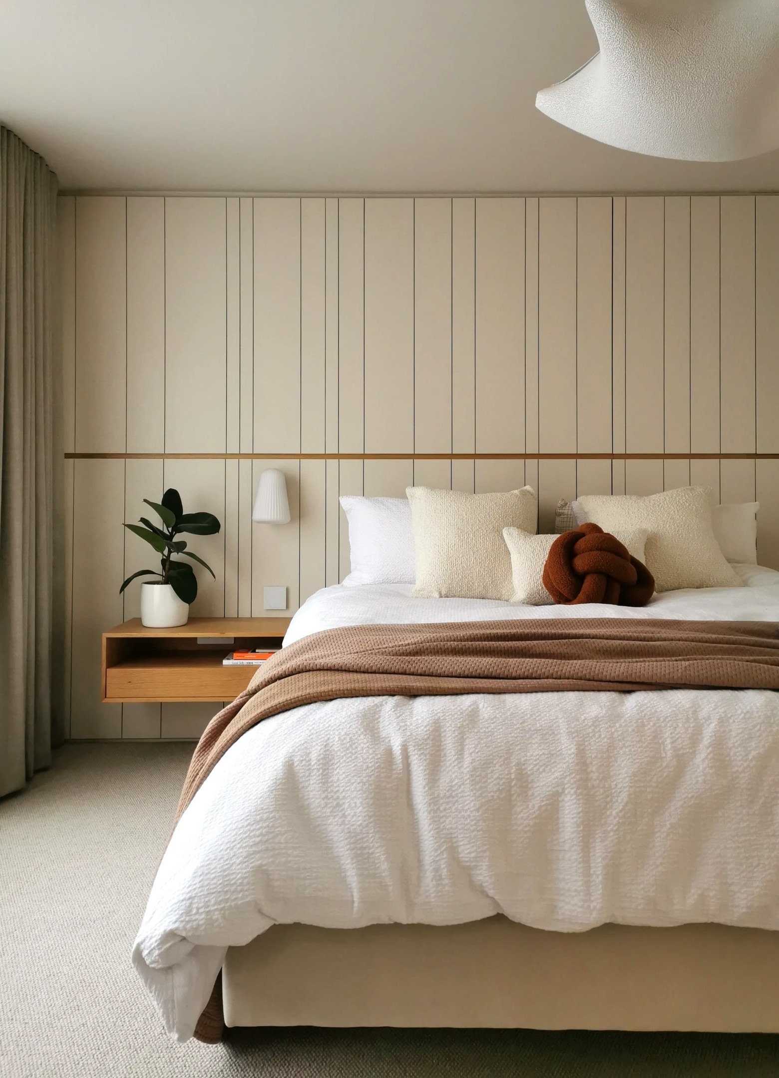 Clever panelling behind the bed in the principal bedroom not only adds texture, interest and a built-in headboard, it also conceals extensive storage, as well as equipment for the home automation system and other services.