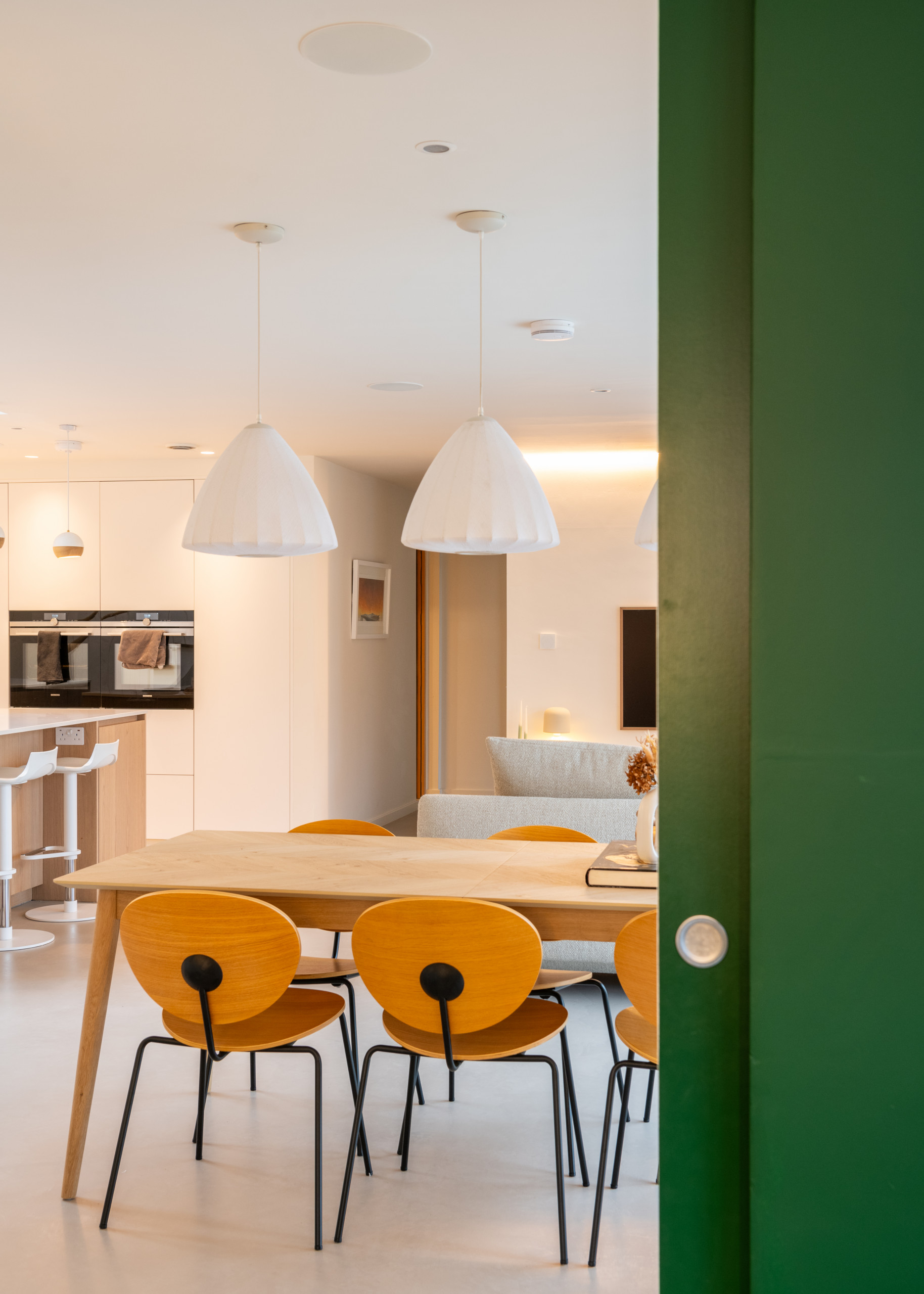 Verso steam-bent ash pendant lights, Tom Raffield. Walls and ceilings painted in Linen Wash, Little Greene.