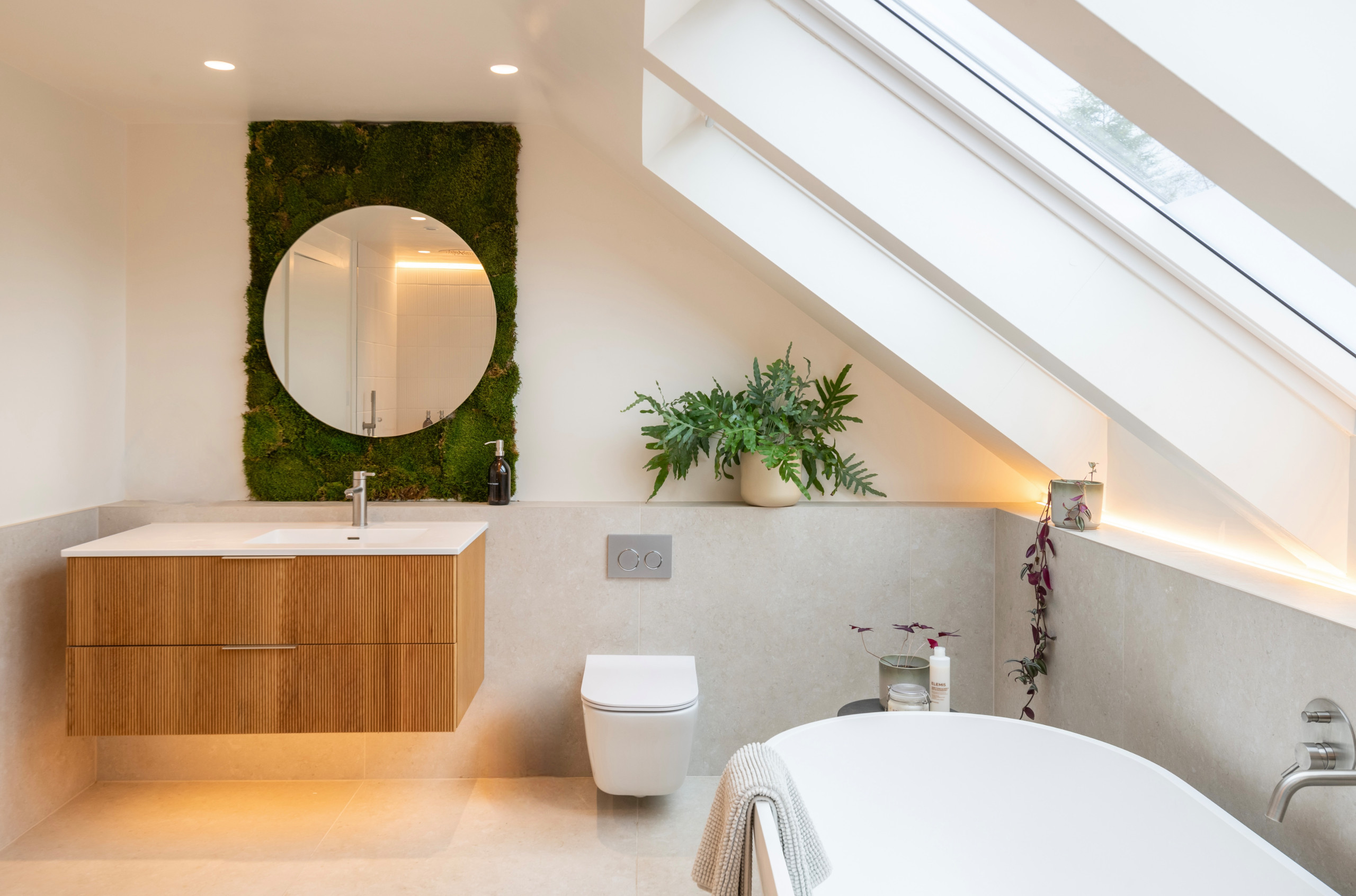 Reeded oak vanity unit with composite top, Harvey George. Preserved moss wall, Highland Moss. Bath, Lusso Stone.