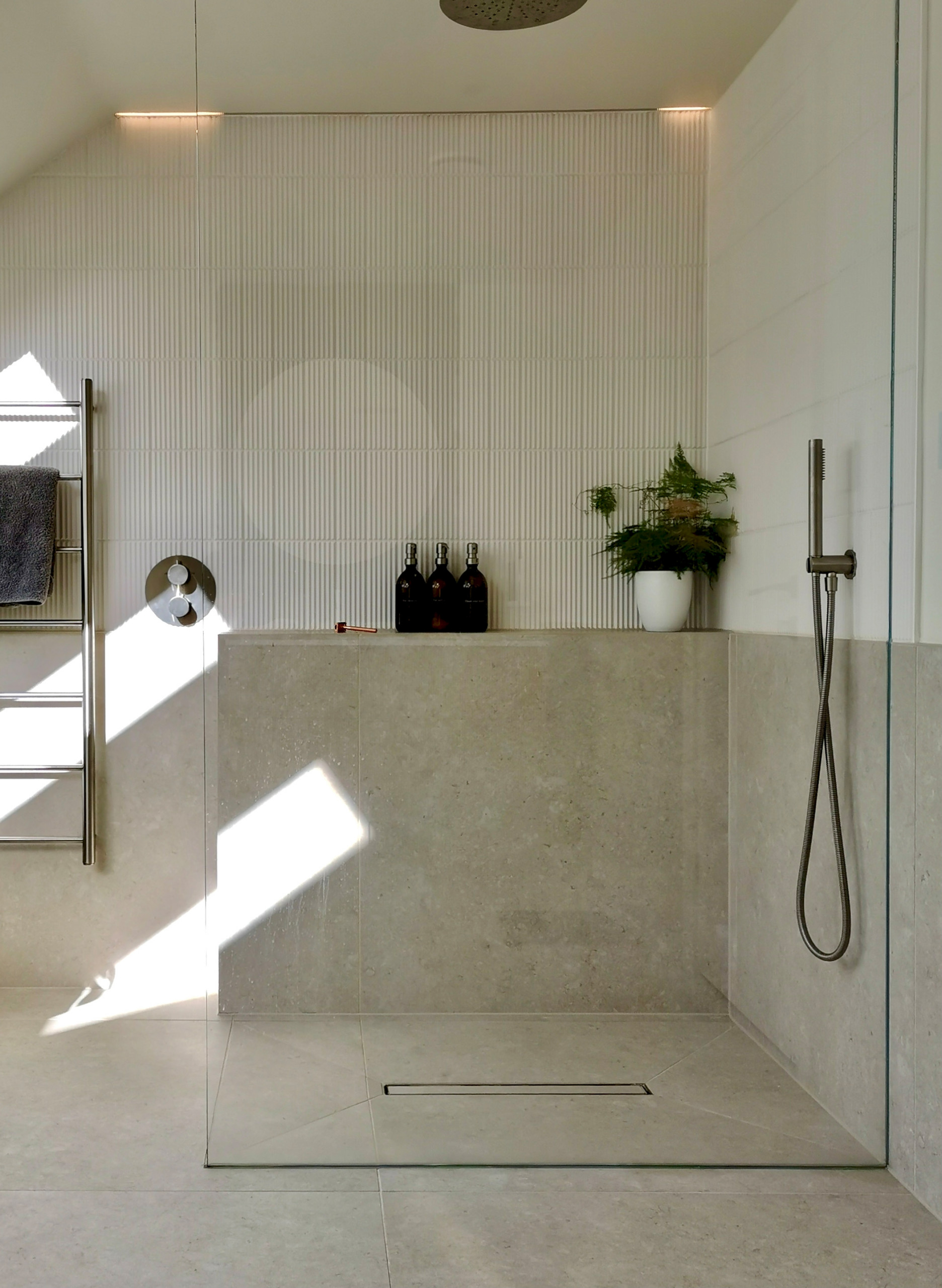 The room has no external window, though there is some natural light via a sun tunnel, just seen reflected in the shower screen. Talking of which, this piece of safety glass was cut to order and Karen had it recessed into wall and floor channel, so as not to have any fixings on show.