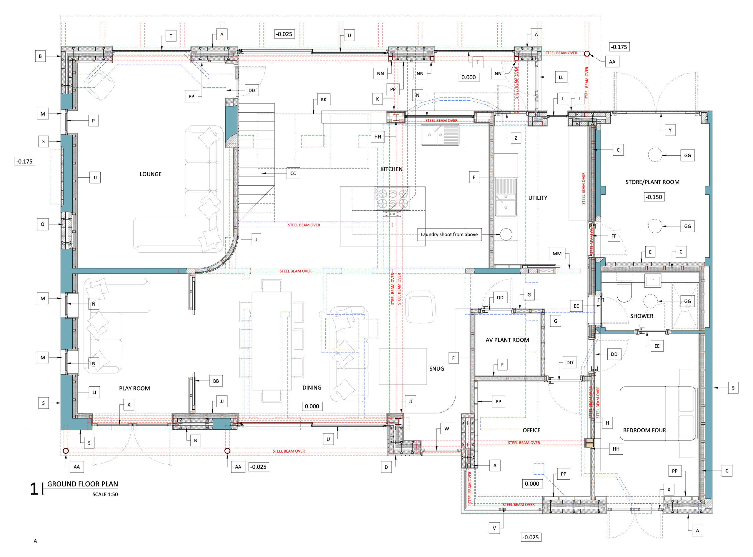 Much of the original building was demolished and rebuilt to a new floor plan. This was, in large part, due to the need to house the new services, including the MVHR, ASHP, rainwater harvesting and home automation systems.