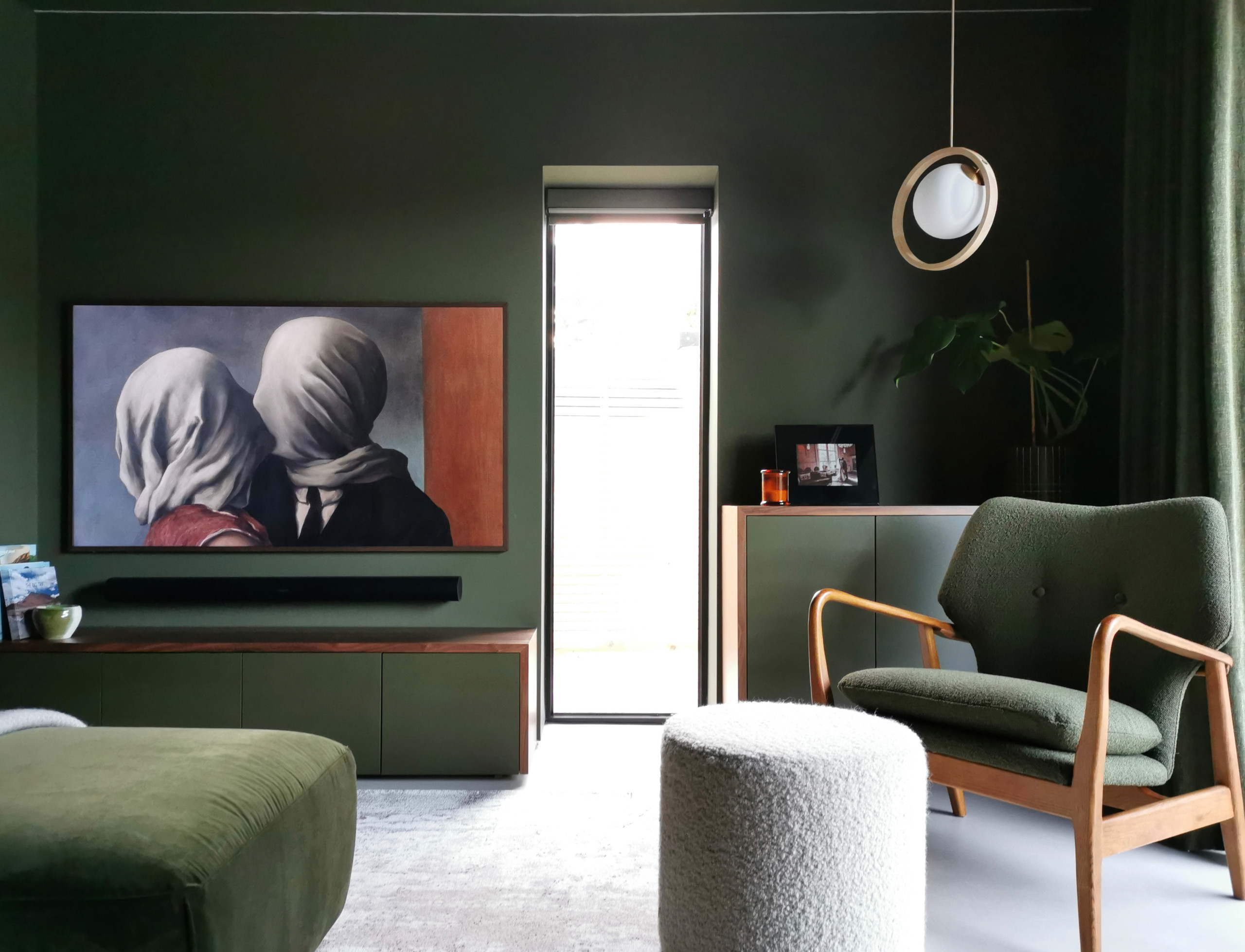 On the ground floor at the front of the house, there’s a separate living room, colour-washed in a deep green with walnut wrapping the joinery. Even the blind is green, carefully matched to the shade of the paint.