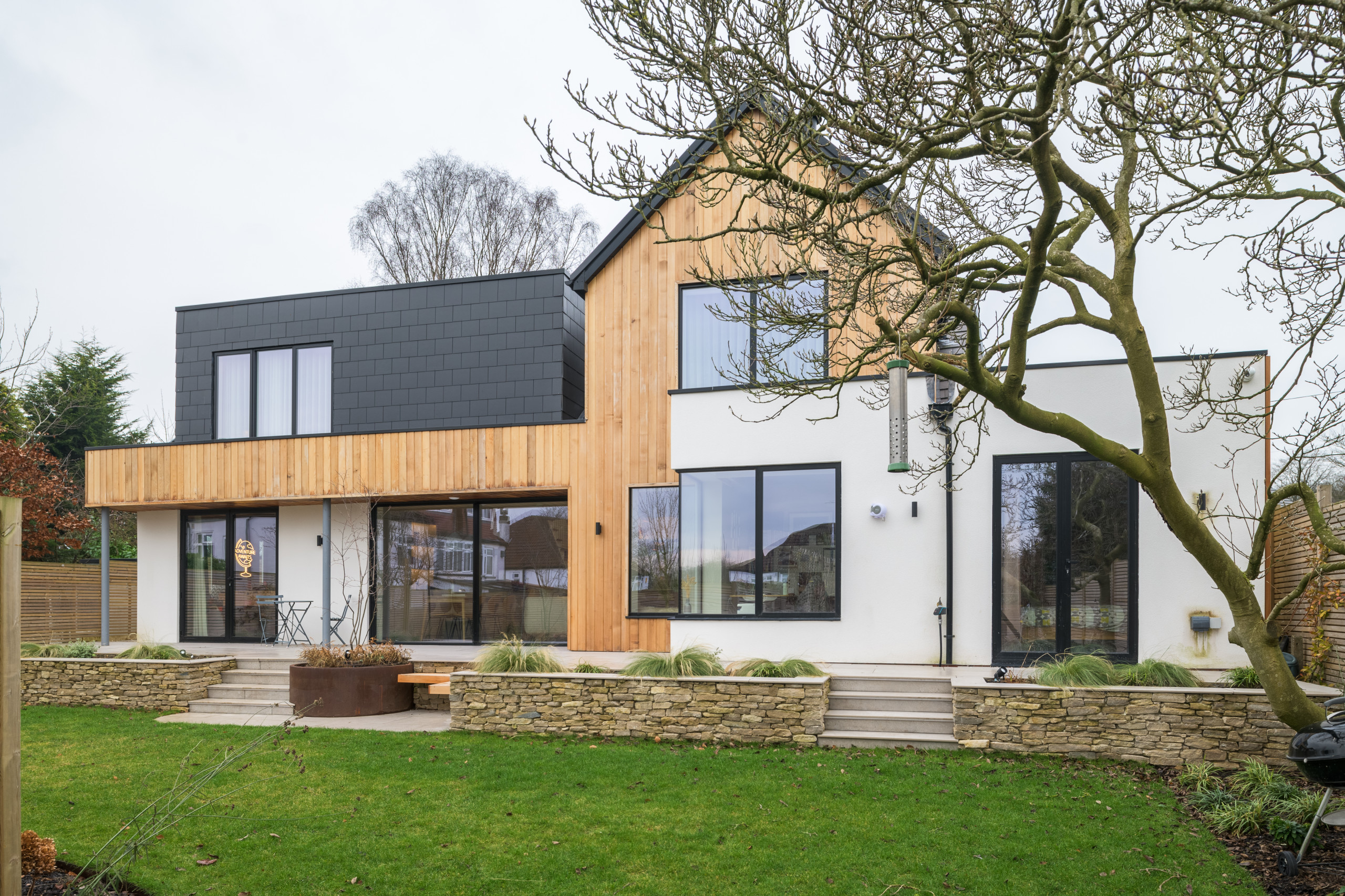 Upstairs, the black clad roof extension contains the principal bedroom and en suite, while the window beneath the pitched roof is the son’s bedroom.