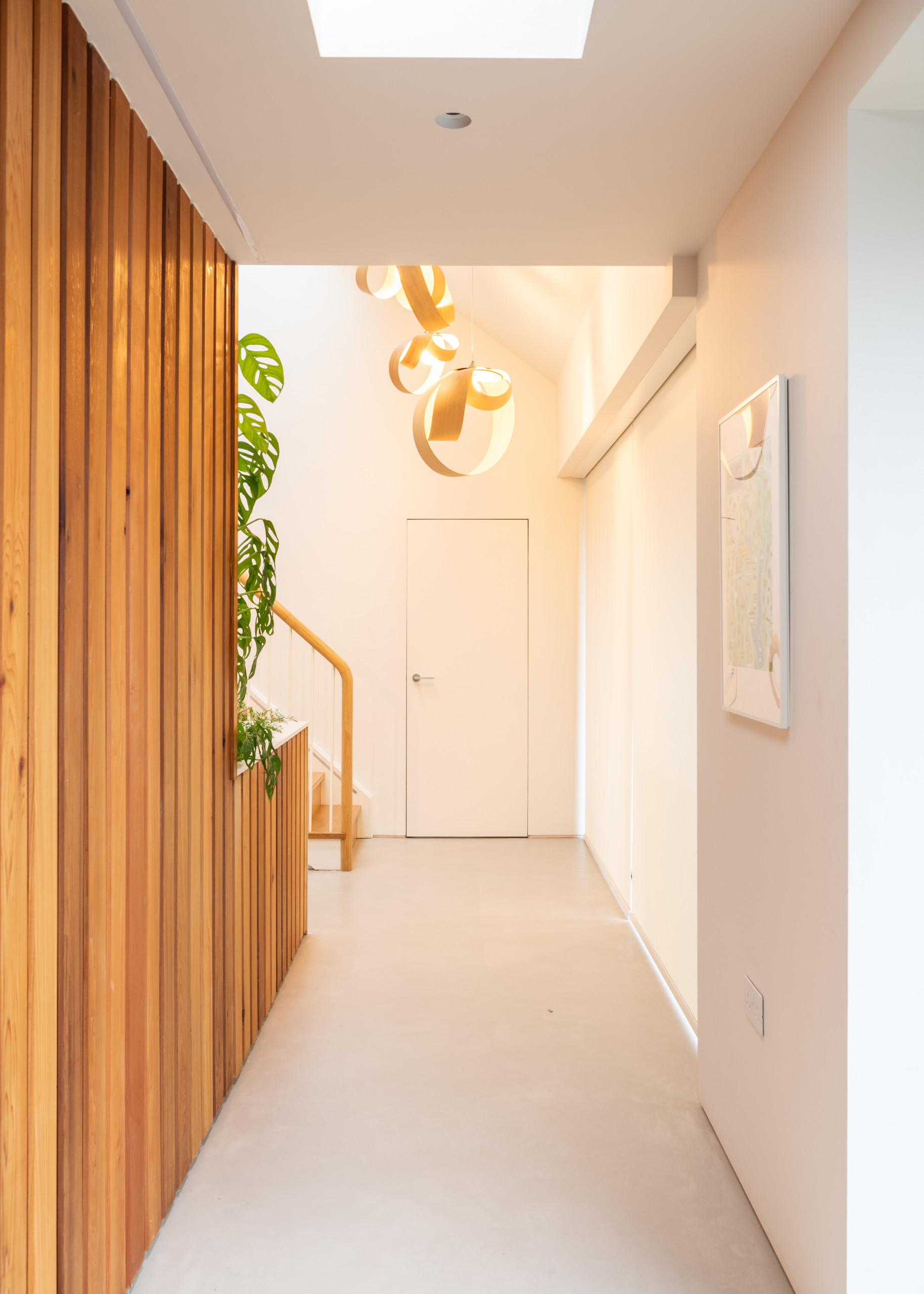 The bright, airy feel of the house is apparent as soon as you walk in the front door and are greeted by this view. Cedar panelling on the left brings organic texture, as do the steam-bent ash pendant lights ahead.