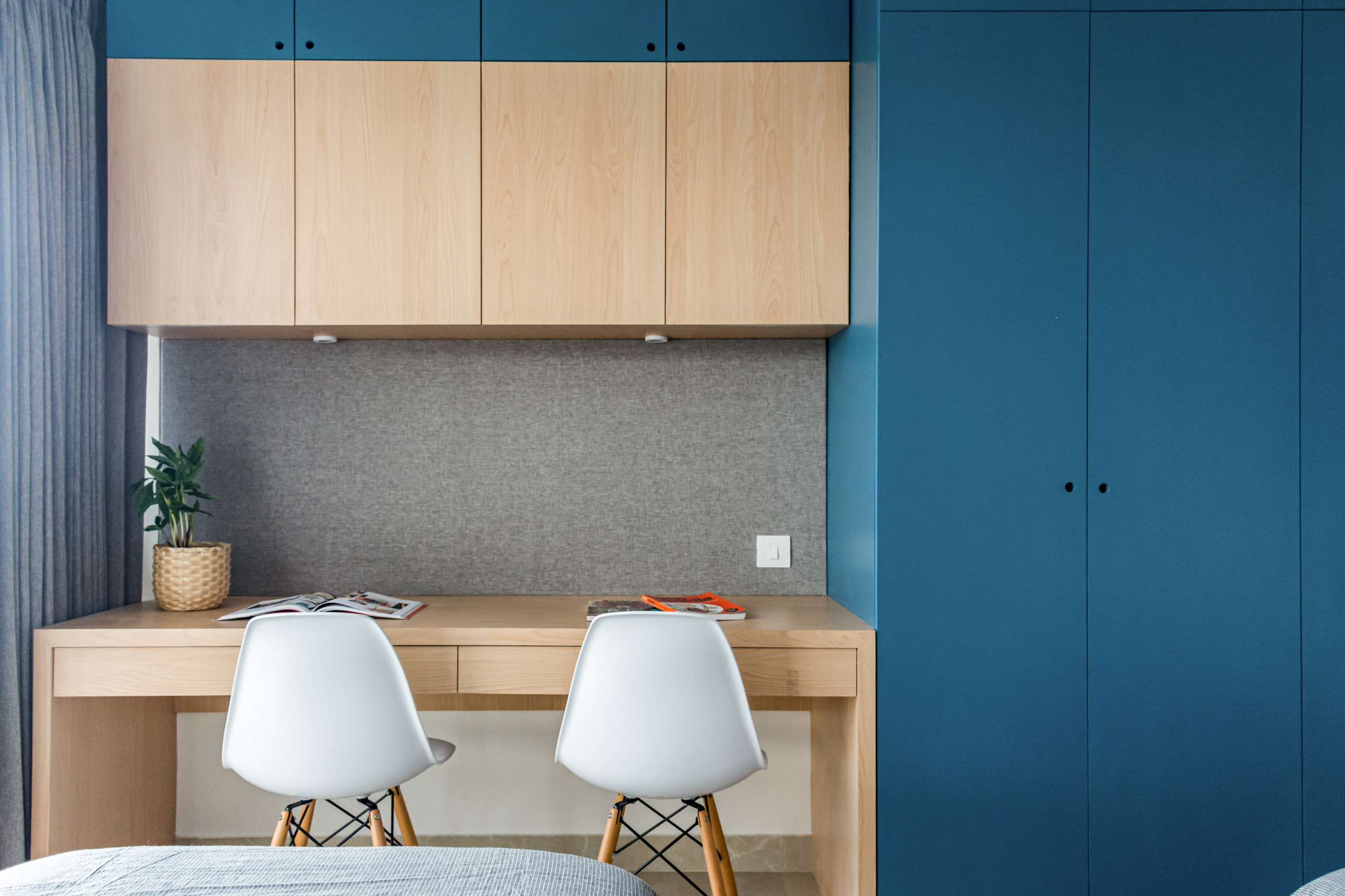 Opposite the bed is a dark blue wardrobe with a built-in study space.