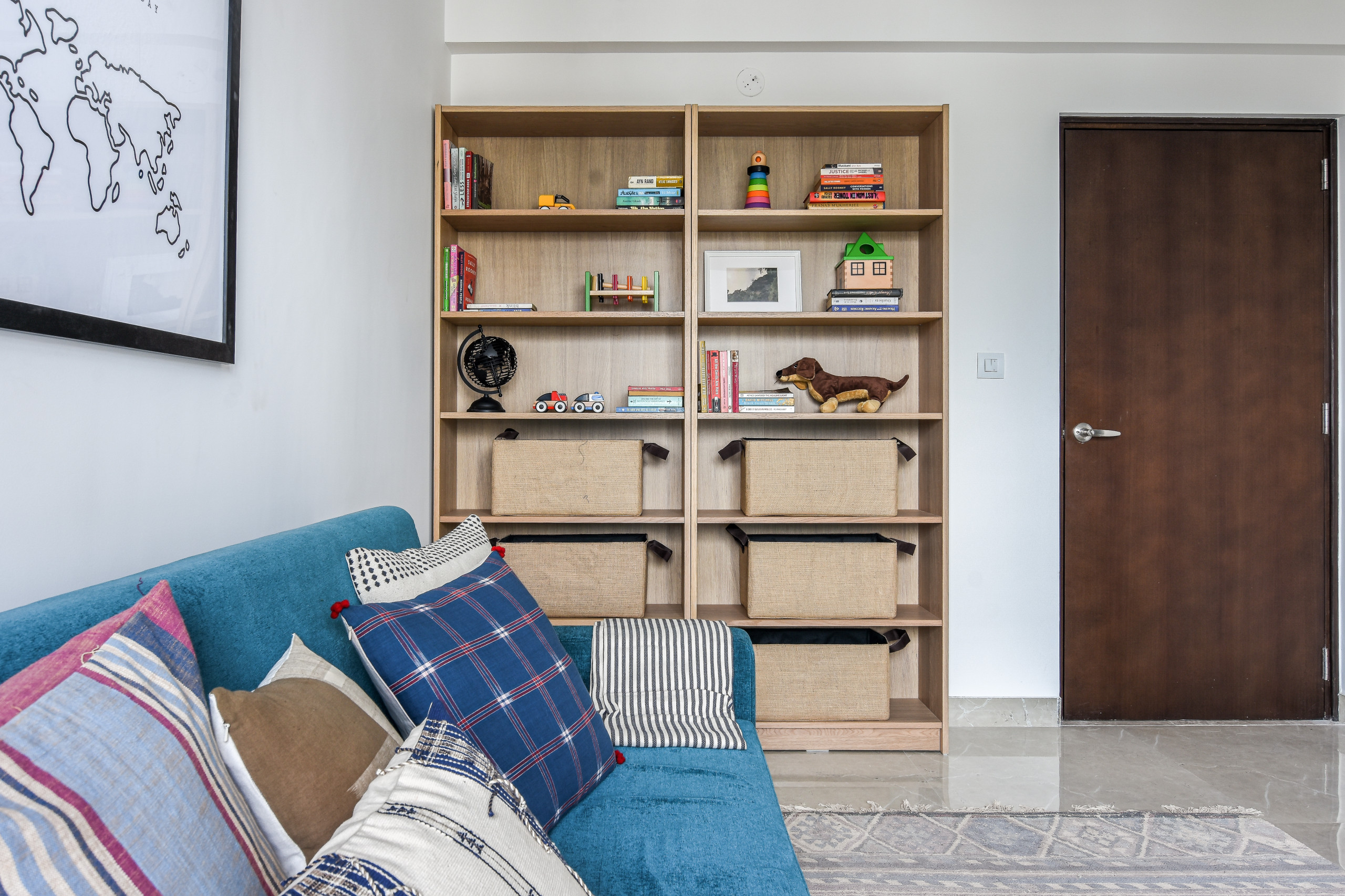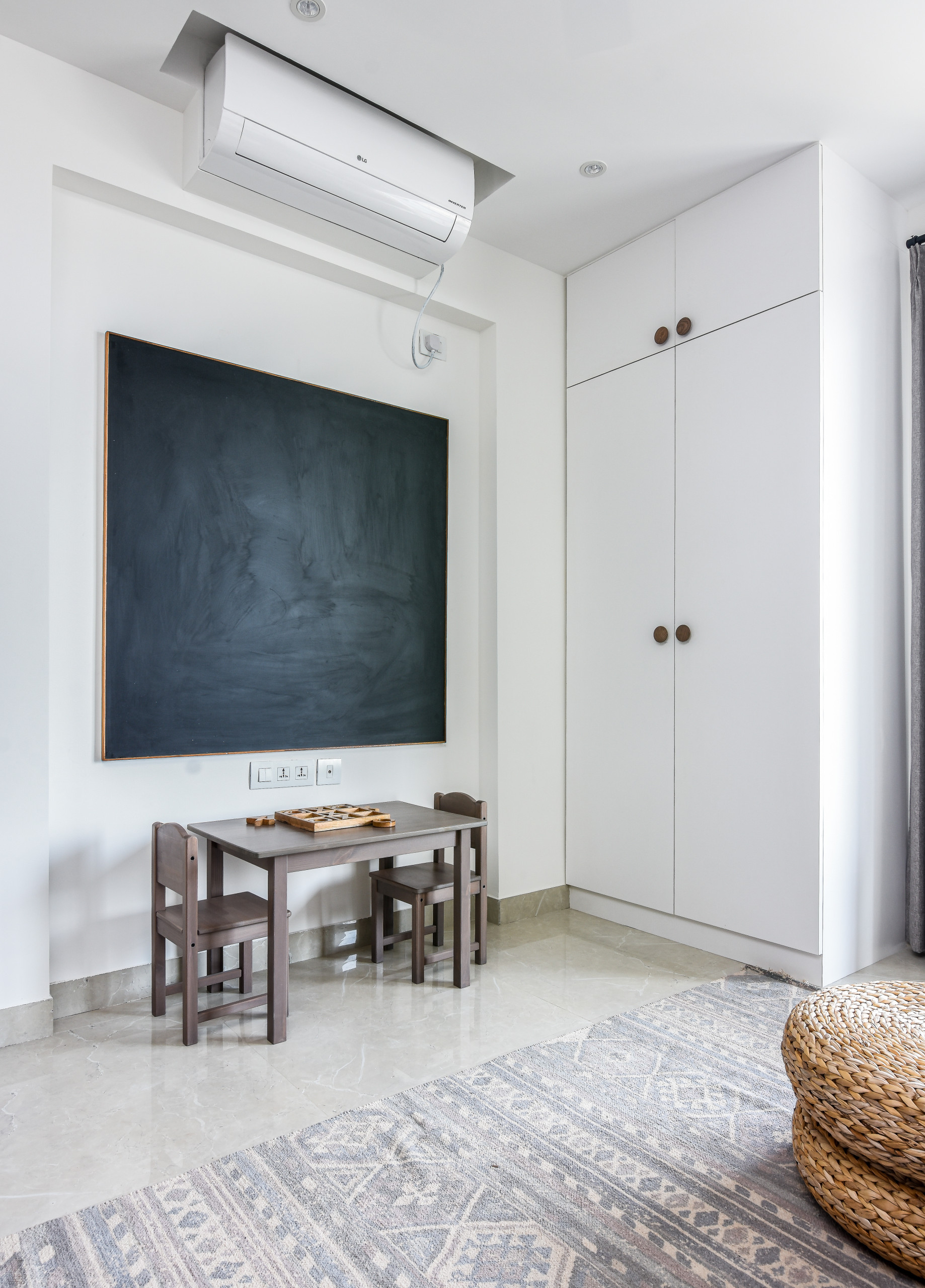 “The space doubles as a guest bedroom, courtesy of a teal sofa-bed,” Sunita explains. “We installed an open shelving unit on one side to serve as storage for toys and knick-knacks. We also brought in a custom chalkboard and a kid-sized table and chairs to give the space a whimsical classroom vibe.”