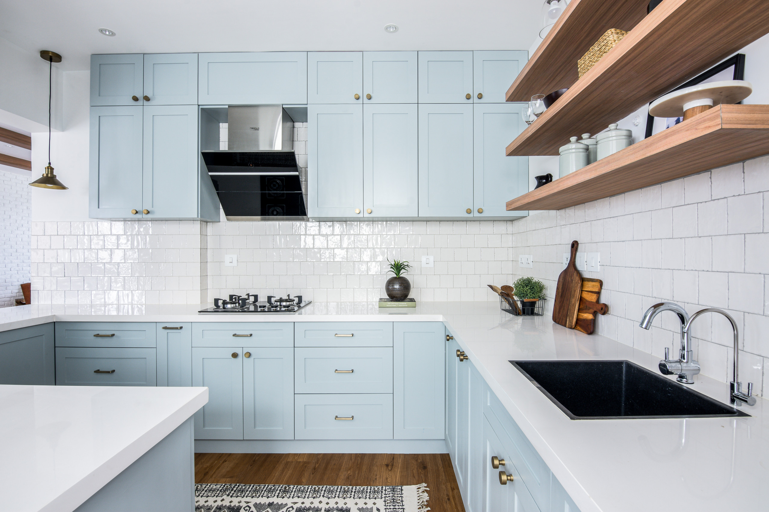 “We juxtaposed shaker-style cabinets with brass hardware against a splashback of square, glossy white tiles,” Sunita says.