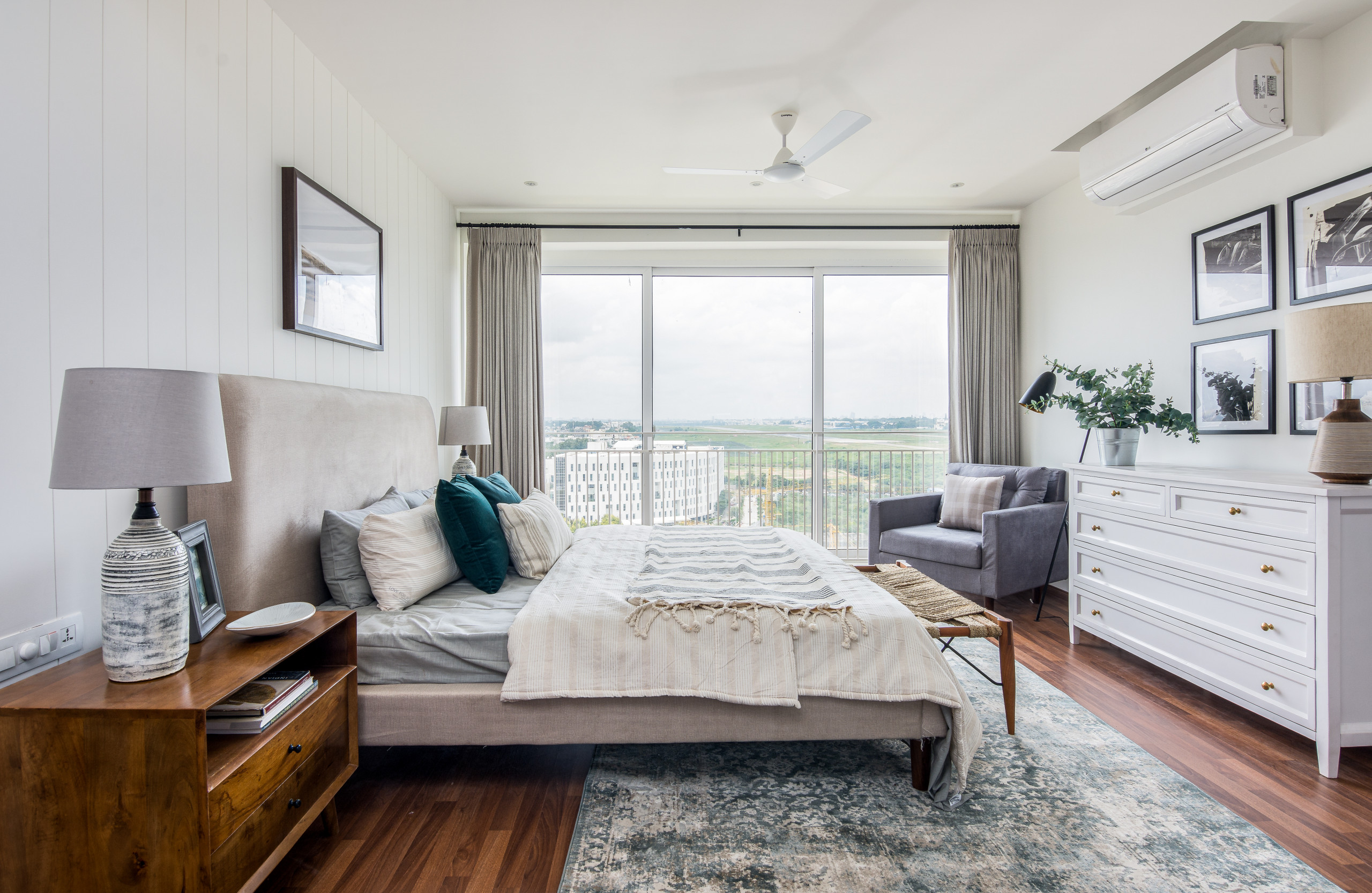 The master bedroom is minimalistic, with muted colours, subtle textures, and a melange of styles.