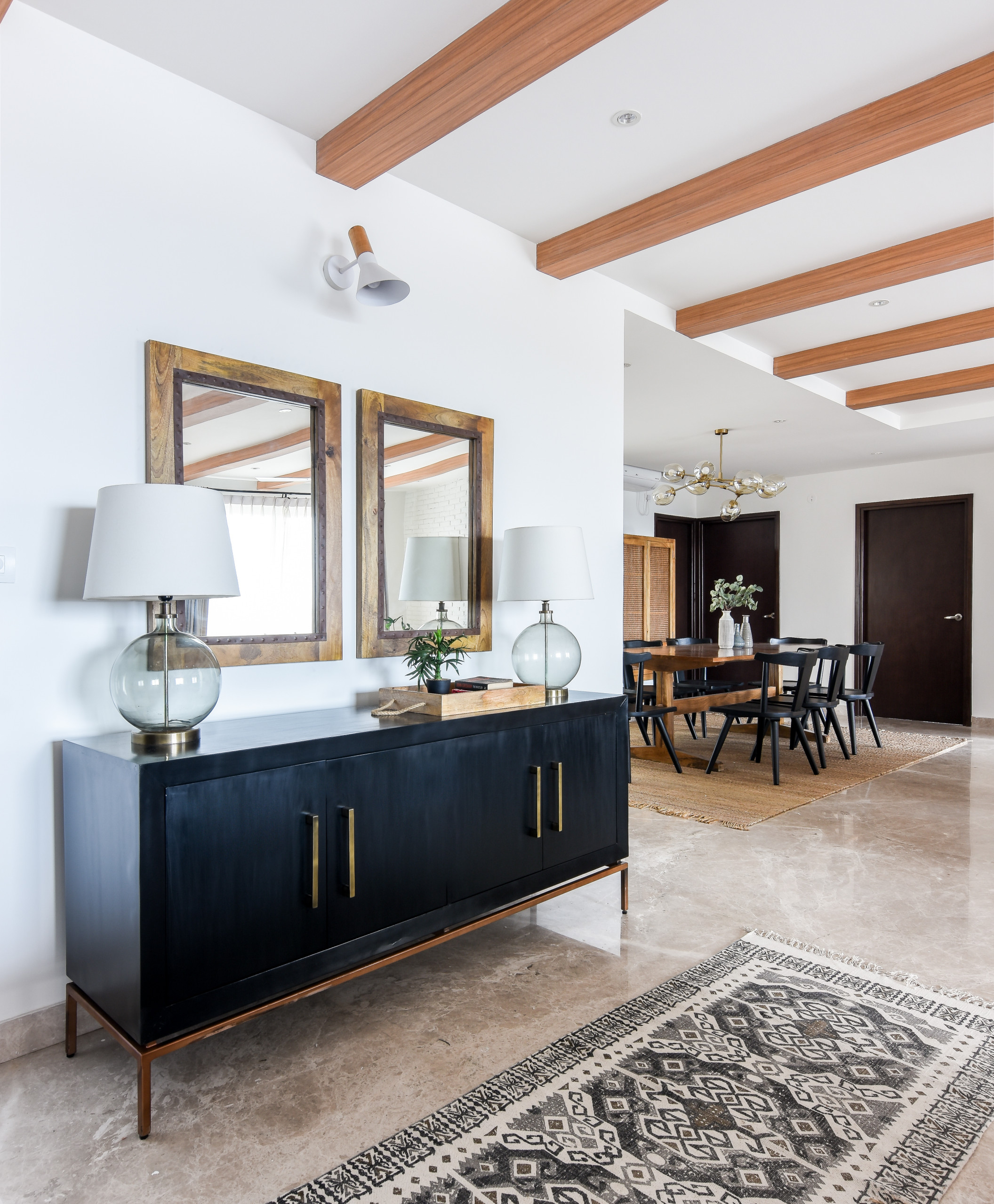 The main door opens into a hall area accentuated by a characterful vignette. Sunita explains: “Since the home didn’t come with a designated foyer, we carved out an entrance zone by highlighting the wall with a credenza, ornamental mirrors and glass globe table lamps,” she says.
