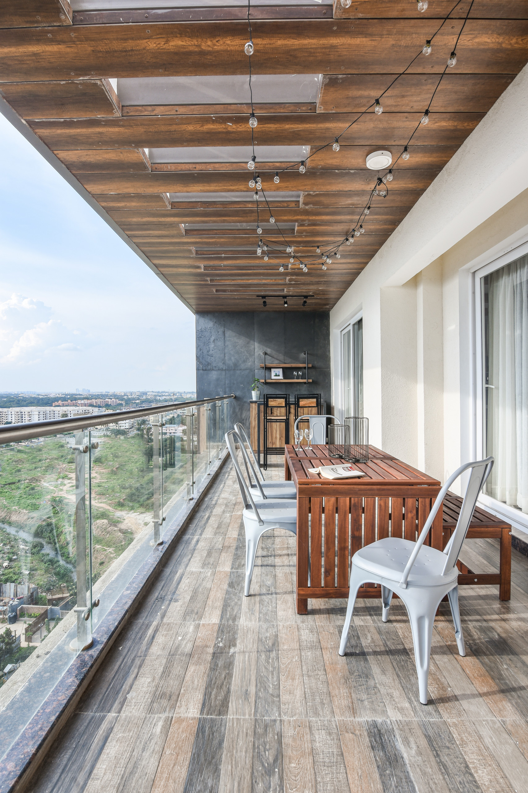 “The client was keen on a bar, and the balcony, given its volume, appeared to be the best place to house it,” Sunita says. “We styled the open bar with industrial elements, such as iron and wood. We also added an outdoor dining nook to turn the balcony into a self-sufficient entertaining zone.”