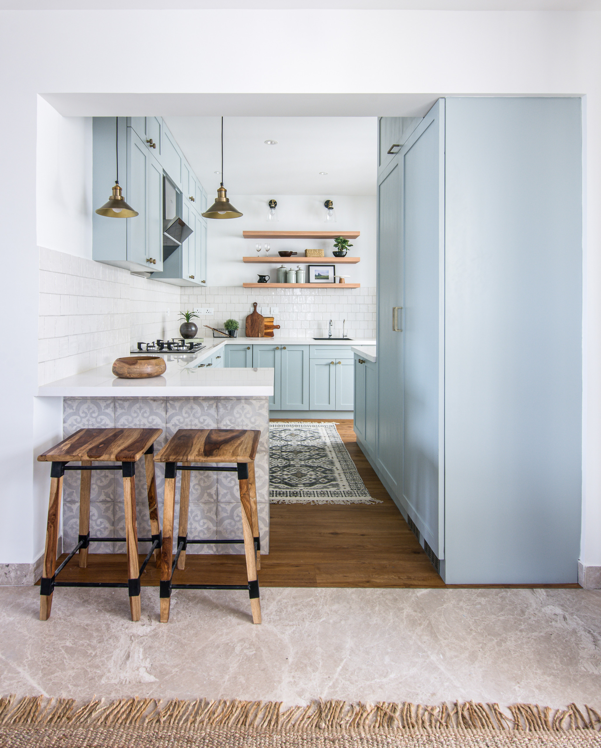 “We also knocked down a wall at the entrance so we could fit in a small breakfast bar. We highlighted it with subtle, grey-patterned tiles and a pair of brass pendants,” Sunita adds.