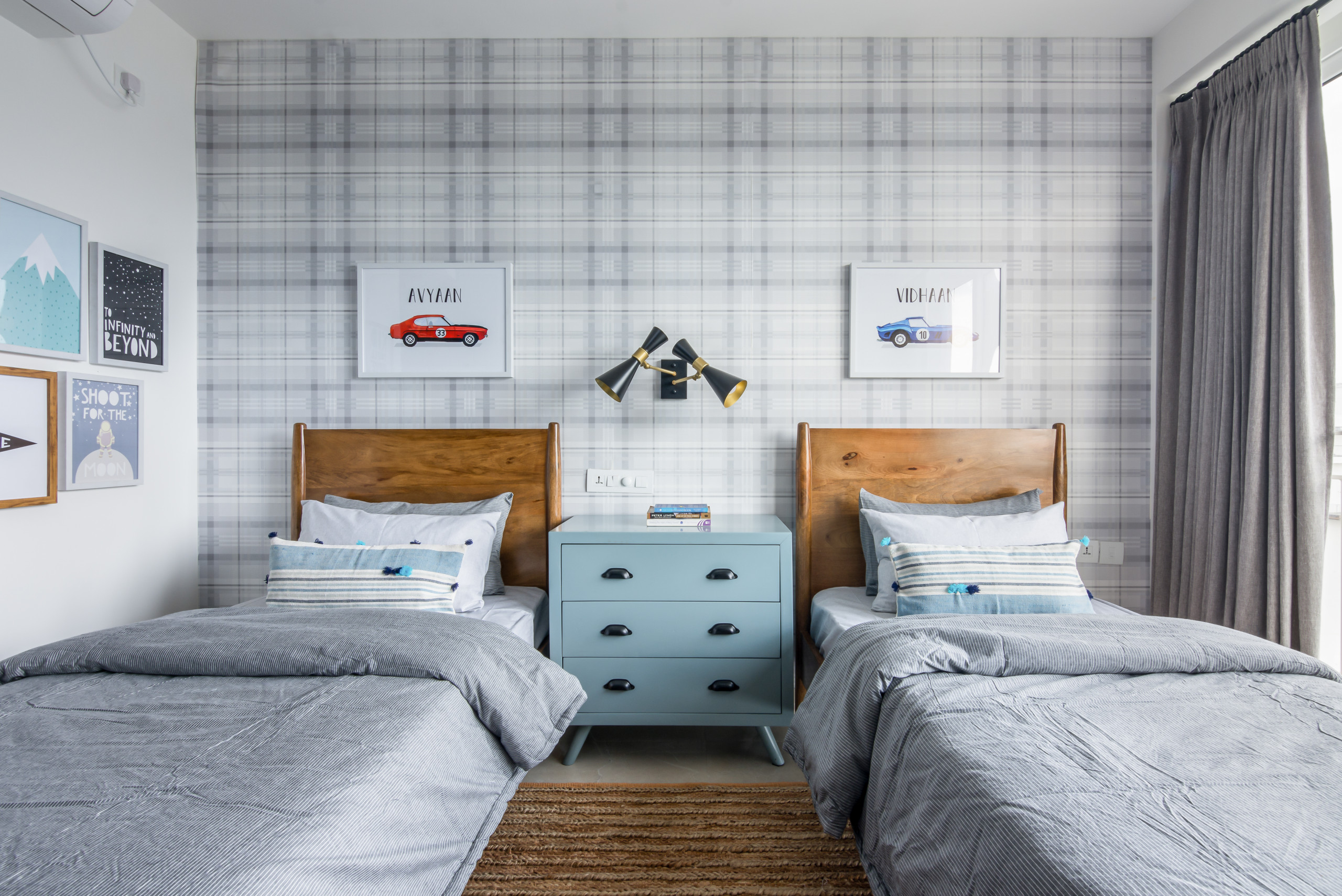 “The clients wanted something that straddled childlike charm and subtle sophistication. We chose a grey, gingham-patterned wallpaper for the feature wall and divided the twin wooden beds with a pale blue chest of drawers,” Sunita says.
