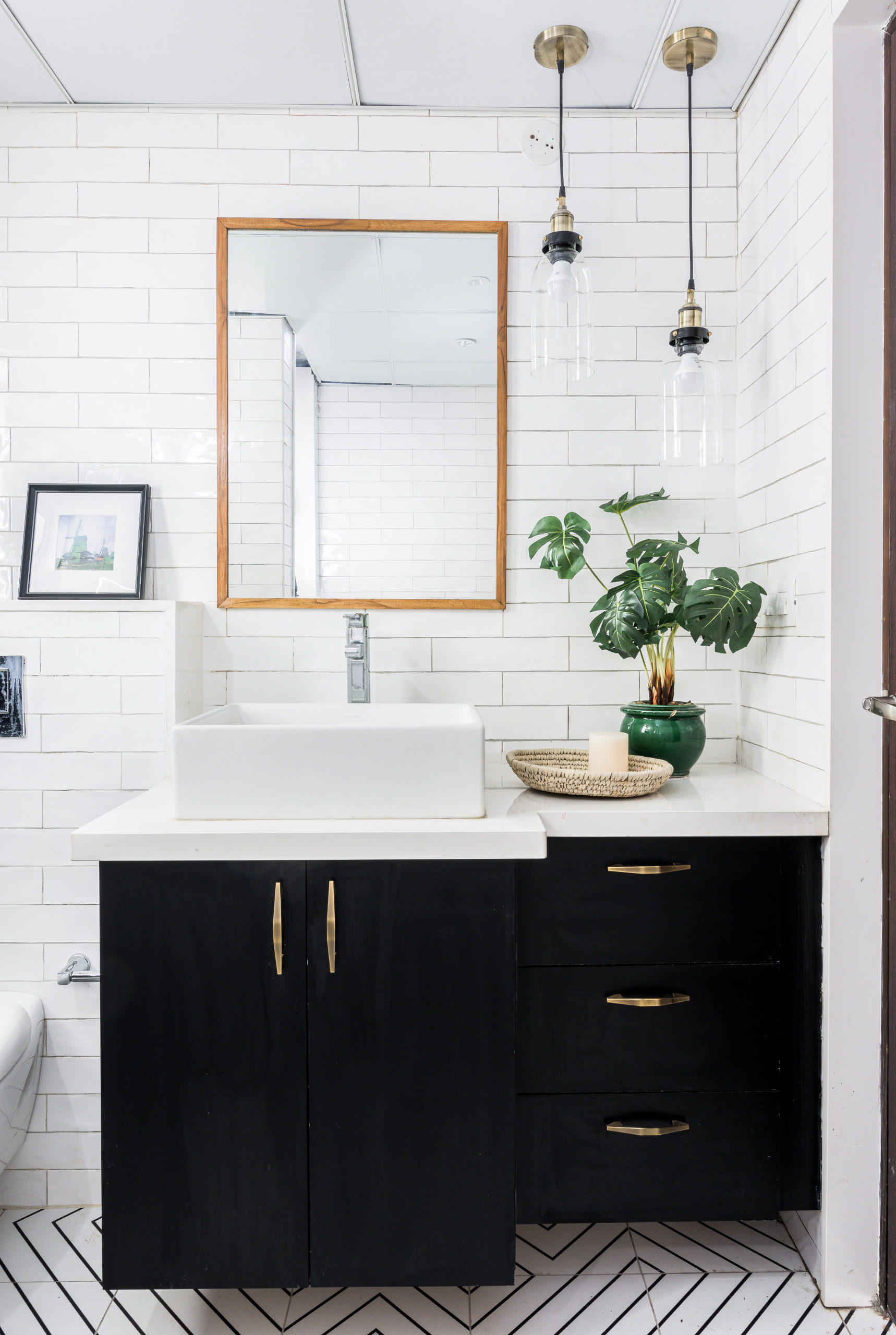 “We counterbalanced the geometric-patterned floor with classic white metro-tiled walls. We also augmented the black cabinetry with brass hardware, and chose a wood-rimmed mirror to warm the space,” Sunita says.
