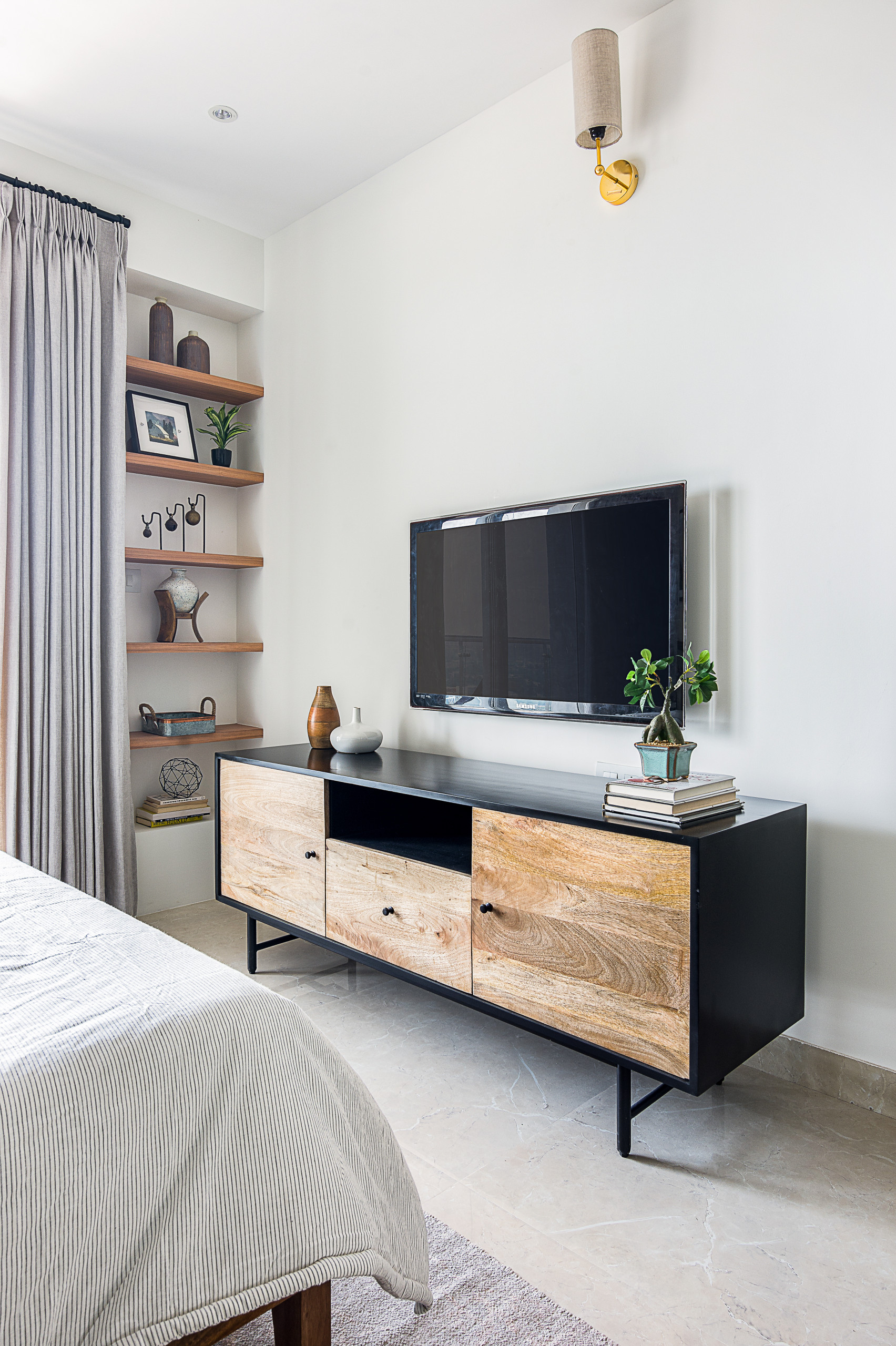 “Since it was a room for elders, we gave it a vintage touch with a wooden bed and traditional white bedside tables,” Sunita says. “We also created sleek wooden shelves in the narrow alcoves on either side of the window.”