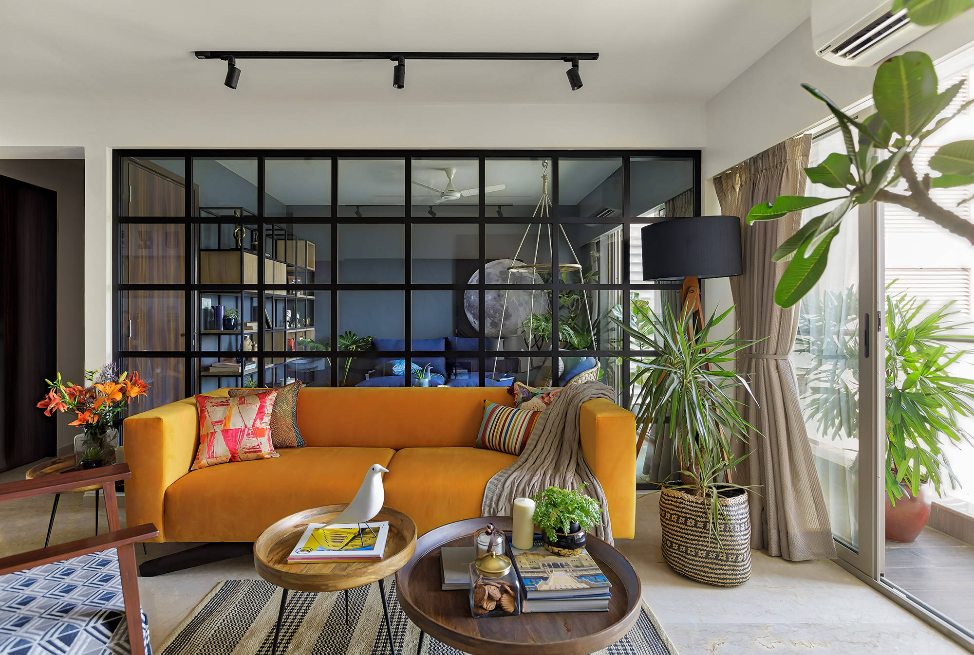 “The balcony is enhanced with large sliding doors that allow plenty of light inside,” Prashant says. “Plants are used to add life to the area and to make the living room visually more spacious.”