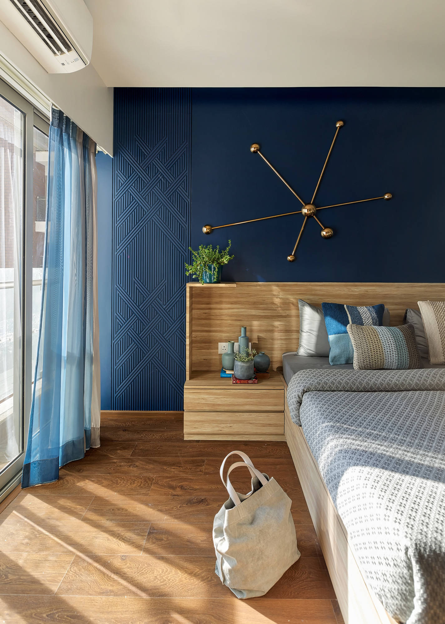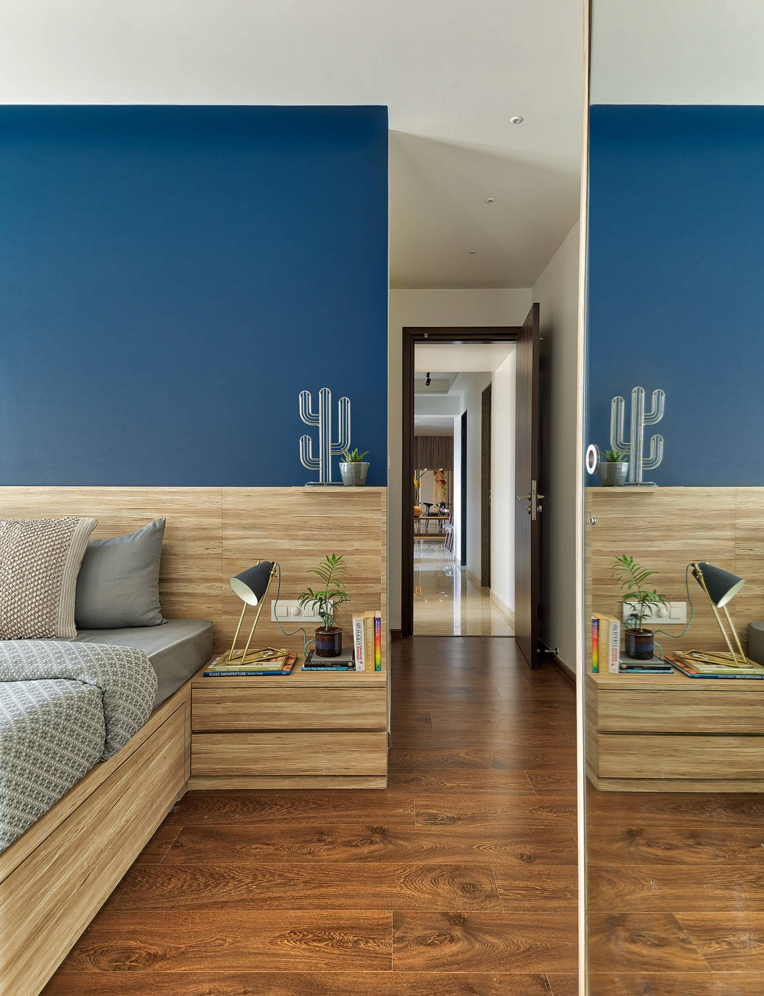 The master bedroom has a smart, sophisticated vibe thanks to the wooden floor and bold blue wall paint featuring a textured pattern. “We chose wooden flooring to help the furniture blend in, thereby giving the room a seamless look,” Prashant says.