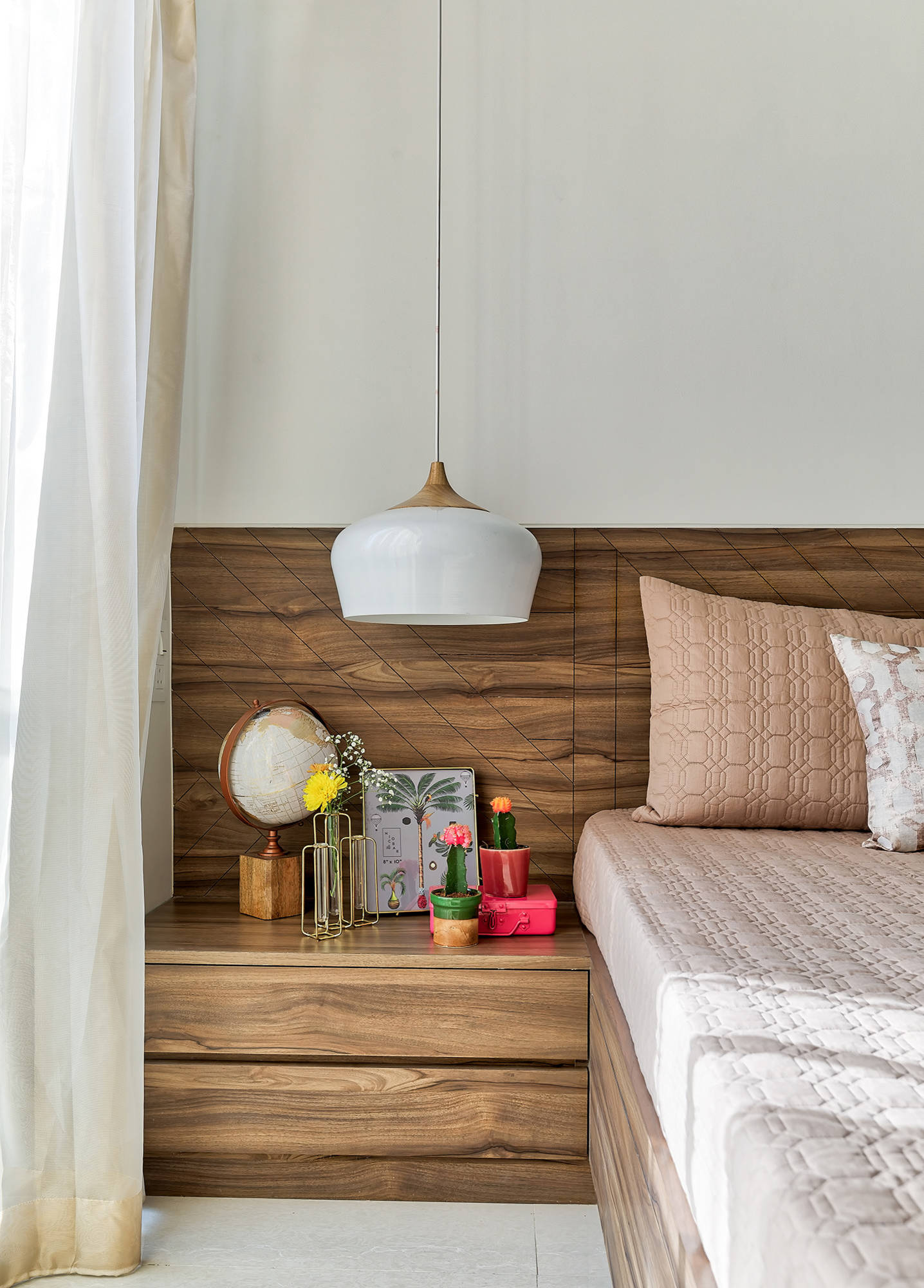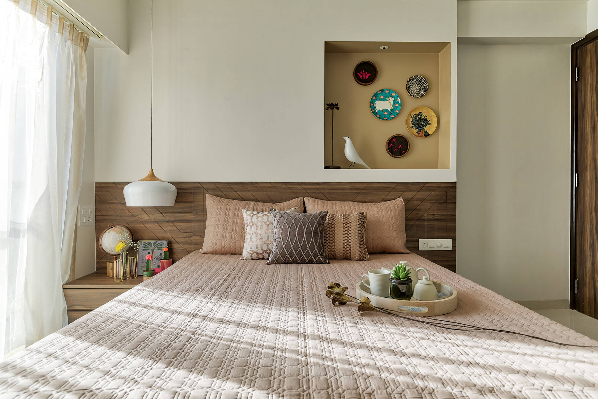 The guest bedroom is a soft, soothing space where “we used big windows to allow more light in and make the room look larger. A small niche was created behind the bed as an accent feature,” Prashant says.