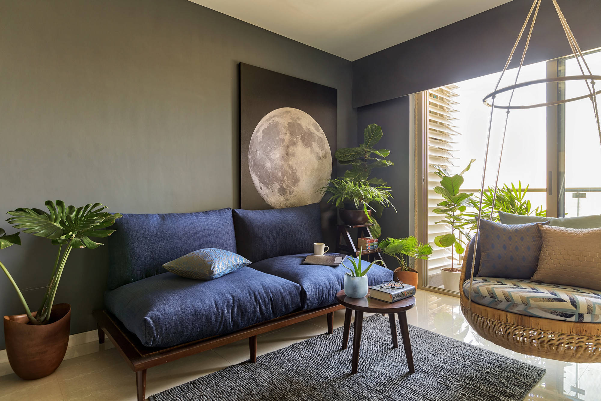 The lounge/study area has a daybed and a swing, plus a moon artwork that adds quaintness to the scheme. “The moon print on canvas is actually a photograph taken by me,” Prashant says.