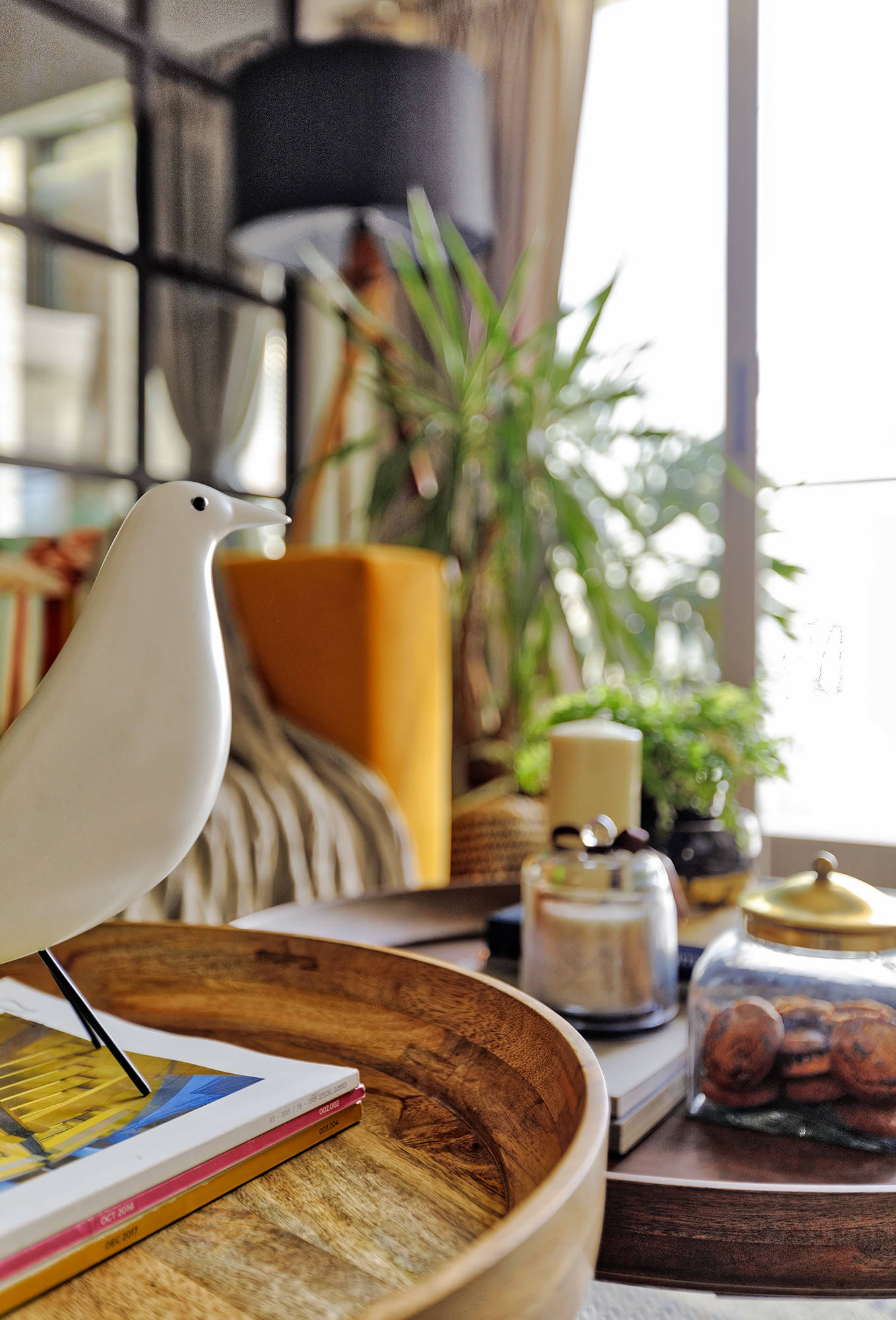 The home opens up to a bright, spacious dining-living room. A large yellow sofa paired with a designer lounge chair and round centre tables makes for a comfortable space.