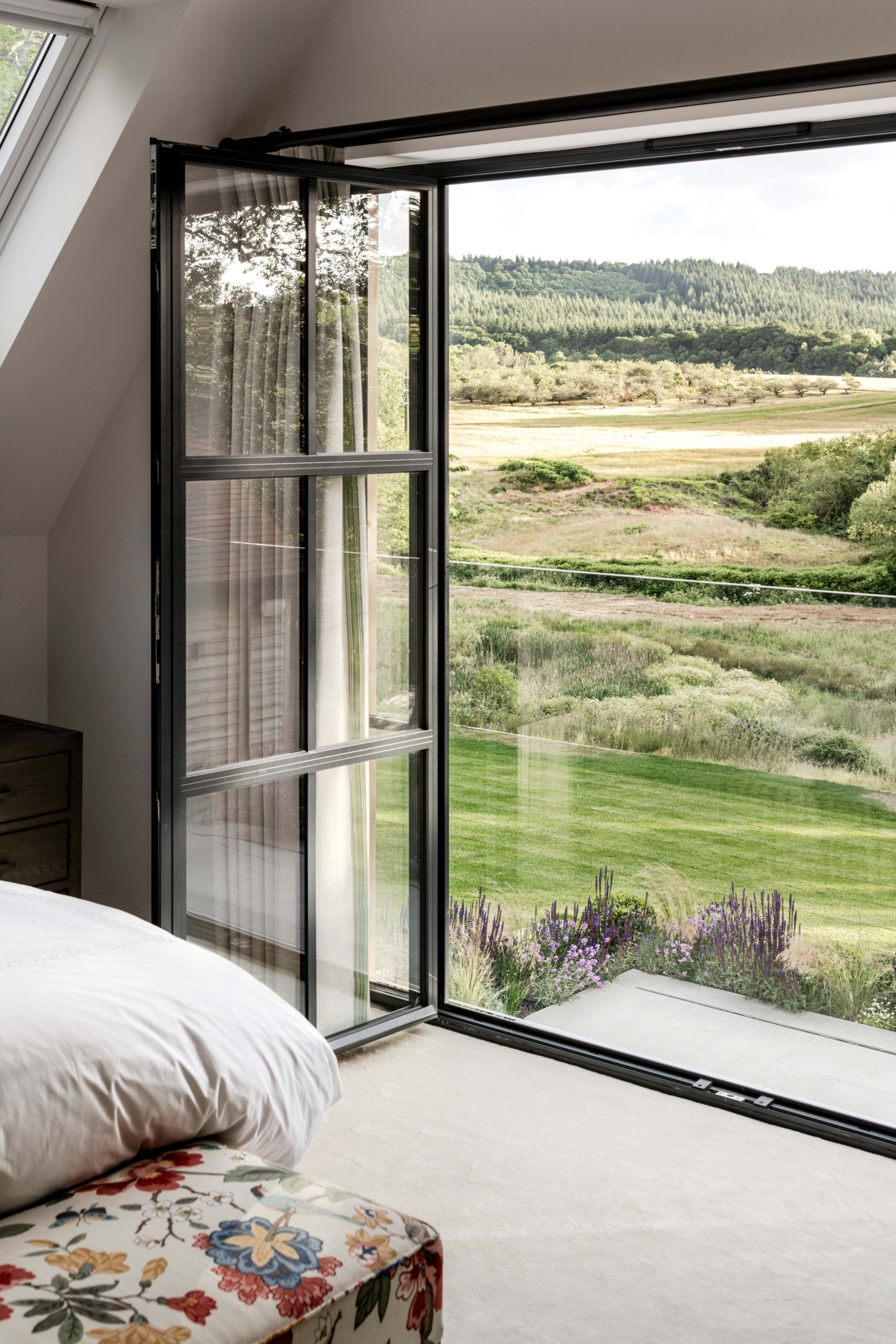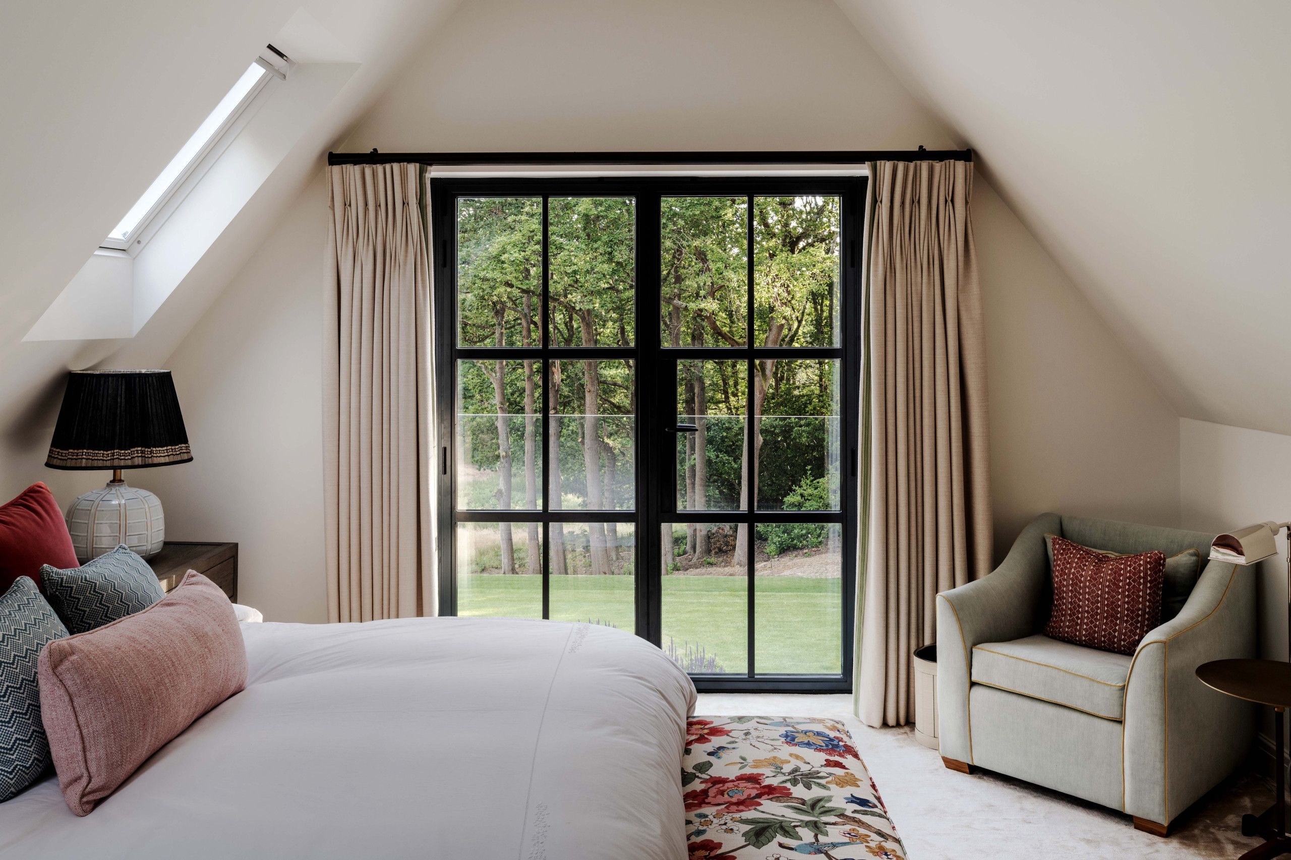 Two sets of double doors open off the main bedroom, one leading onto the terrace and the other, to the right, overlooking woodland. Here, a glass balustrade is just visible, installed because the room is around 700mm above ground level.