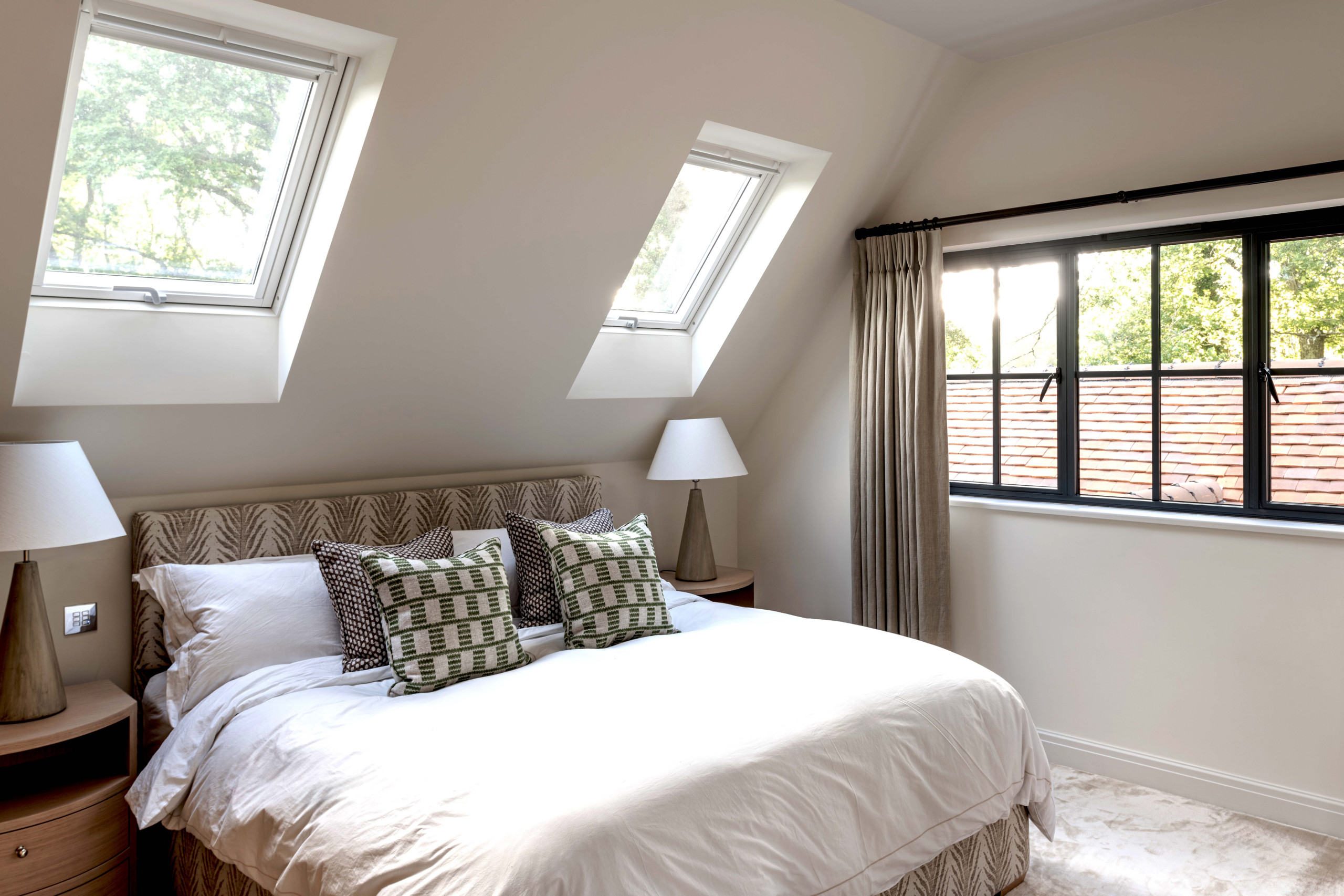 This guest bedroom overlooks the extension. Paul was able to replace the existing rooflights upstairs, which were old-fashioned and not working very well.