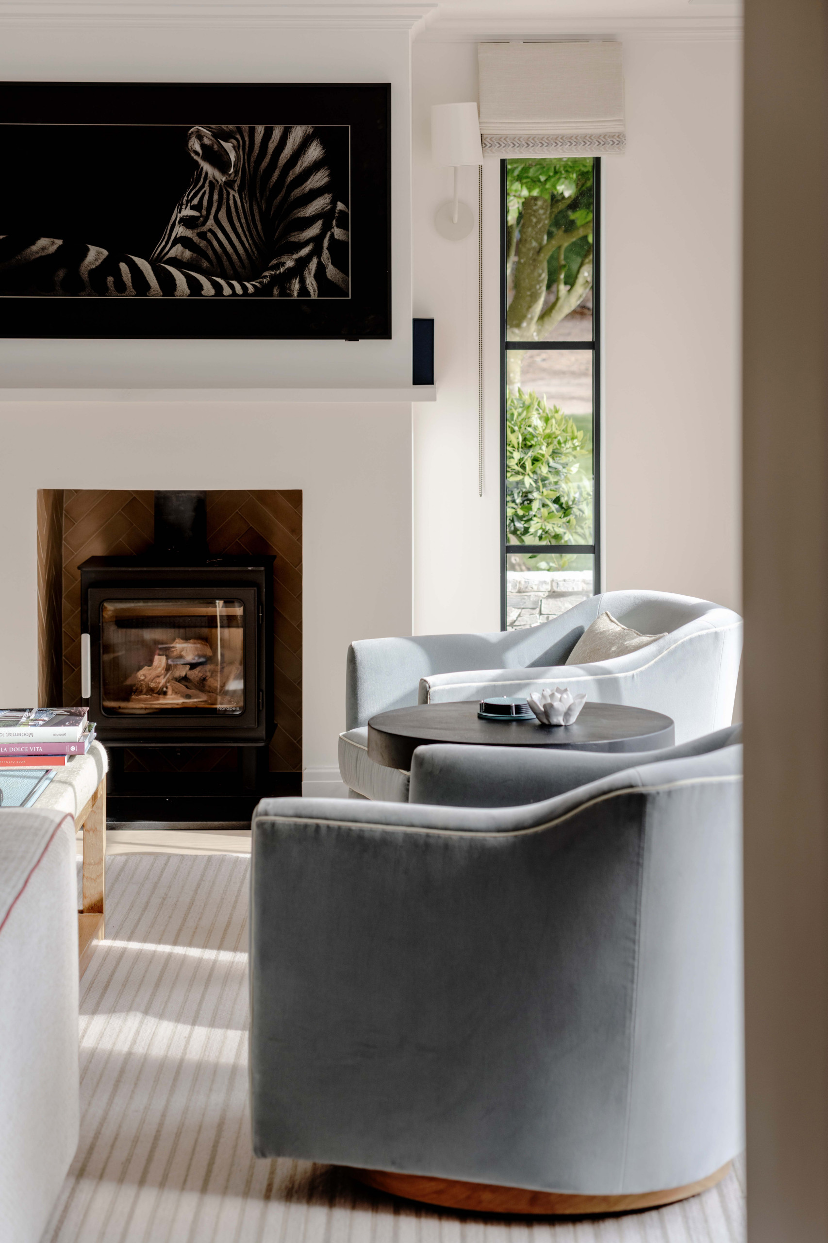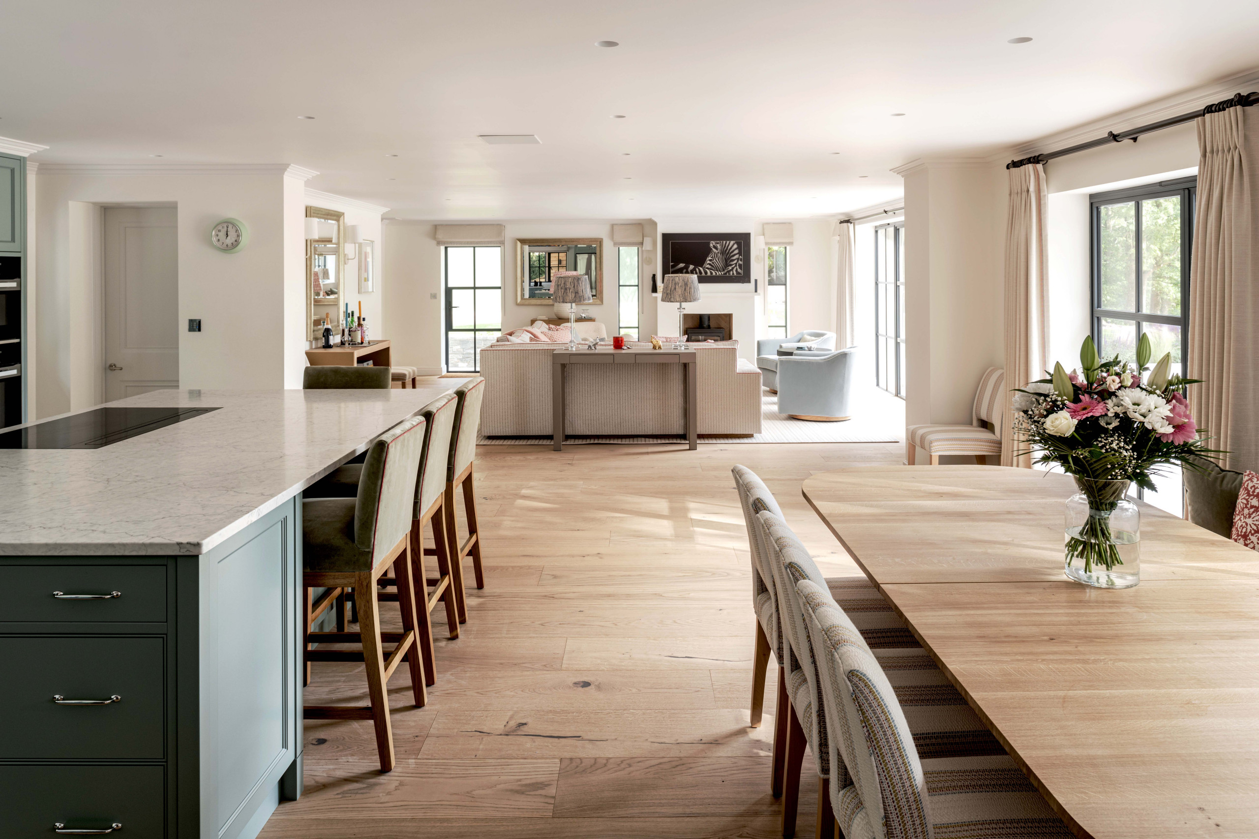 At the other end of the room, the bespoke kitchen, which is painted in a grey-blue with a Carrara marble-style quartz worktop, is now open to the dining area for sociable gatherings.
