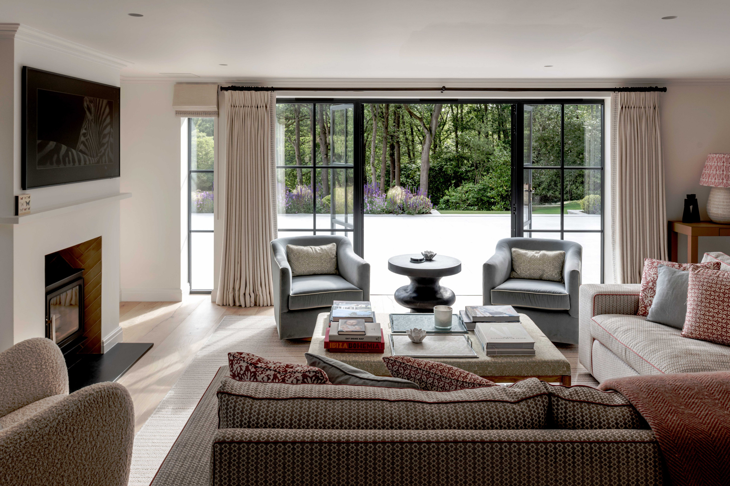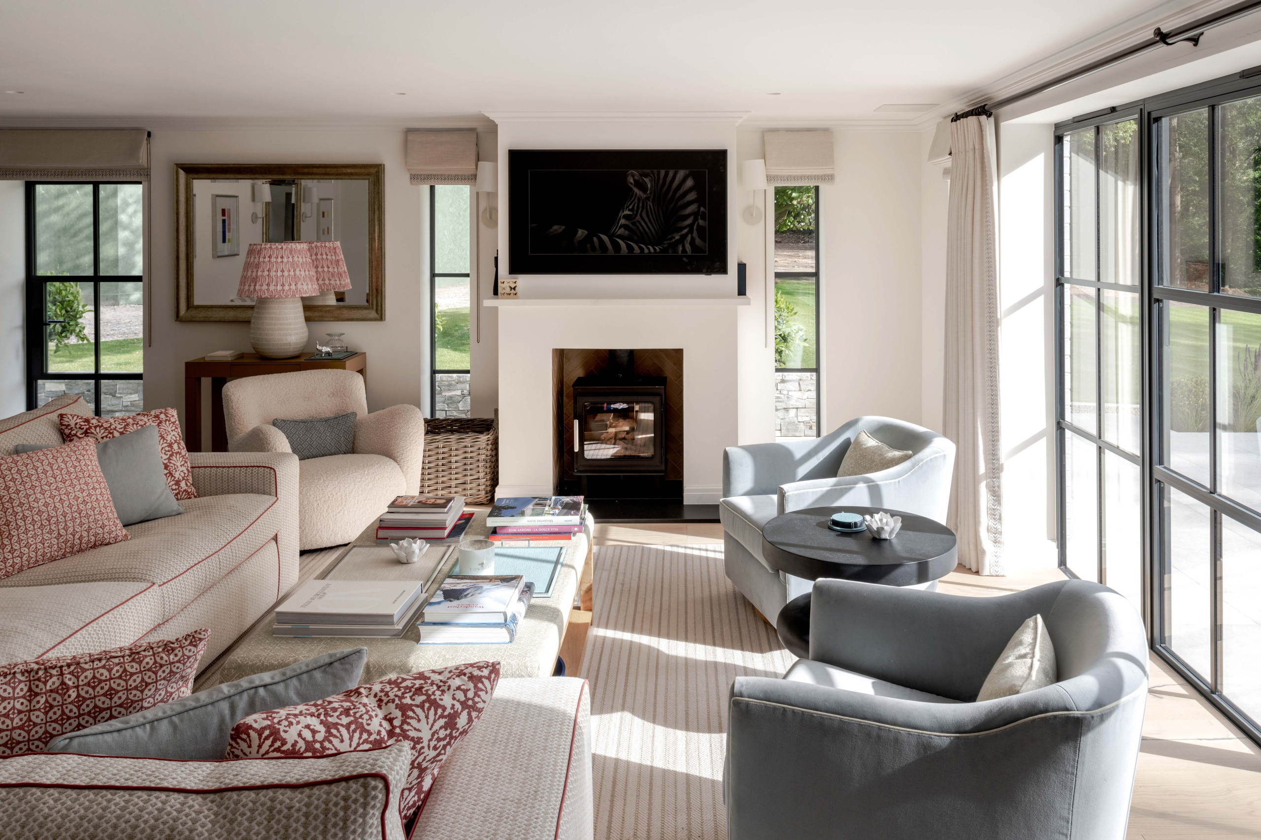 The living area, seen here, has a large, custom-made, L-shaped sofa, which, along with the rug, helps to zone the space. The decor is both comfortable and classic, with an abundance of tactile textiles and patterns in soft tones.