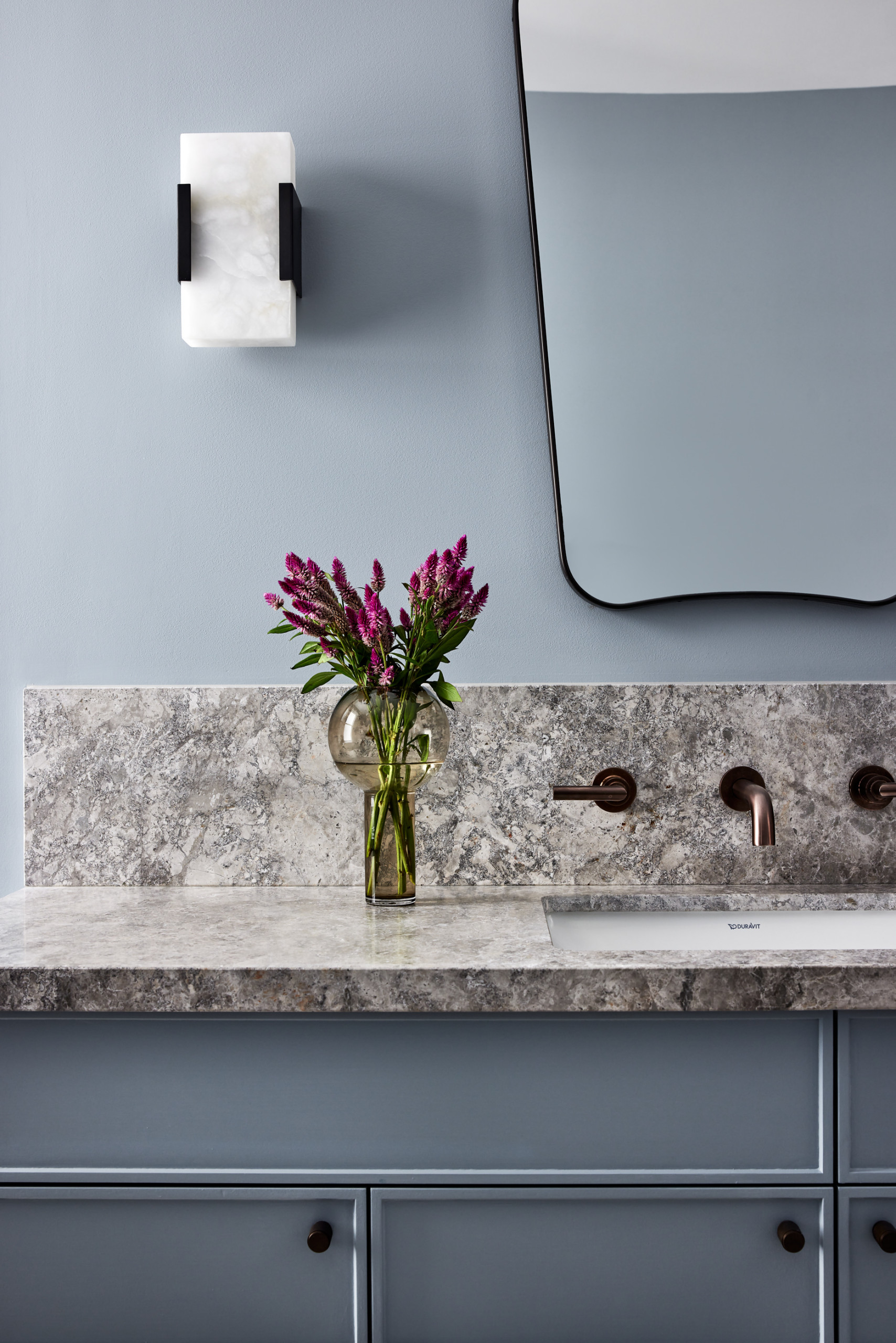 The client’s love of blue drove the design for the bathroom, with dusty-blue textured wall tiles taking a starring role in the space. Lori complemented these with bronze tapware and a marble vanity unit top and splashback.