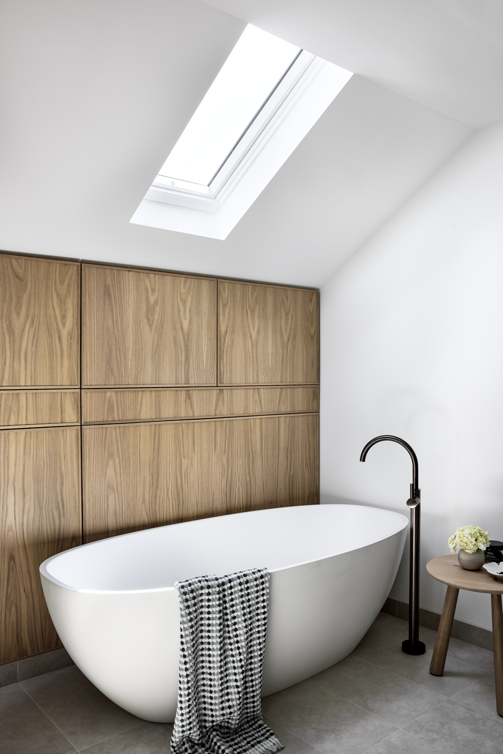 Lori combined a small and awkward bathroom and a wardrobe to create a spacious new en suite for her clients. It’s now a calm, light-filled retreat, with stunning bespoke joinery and a curvy, freestanding bath at its heart.