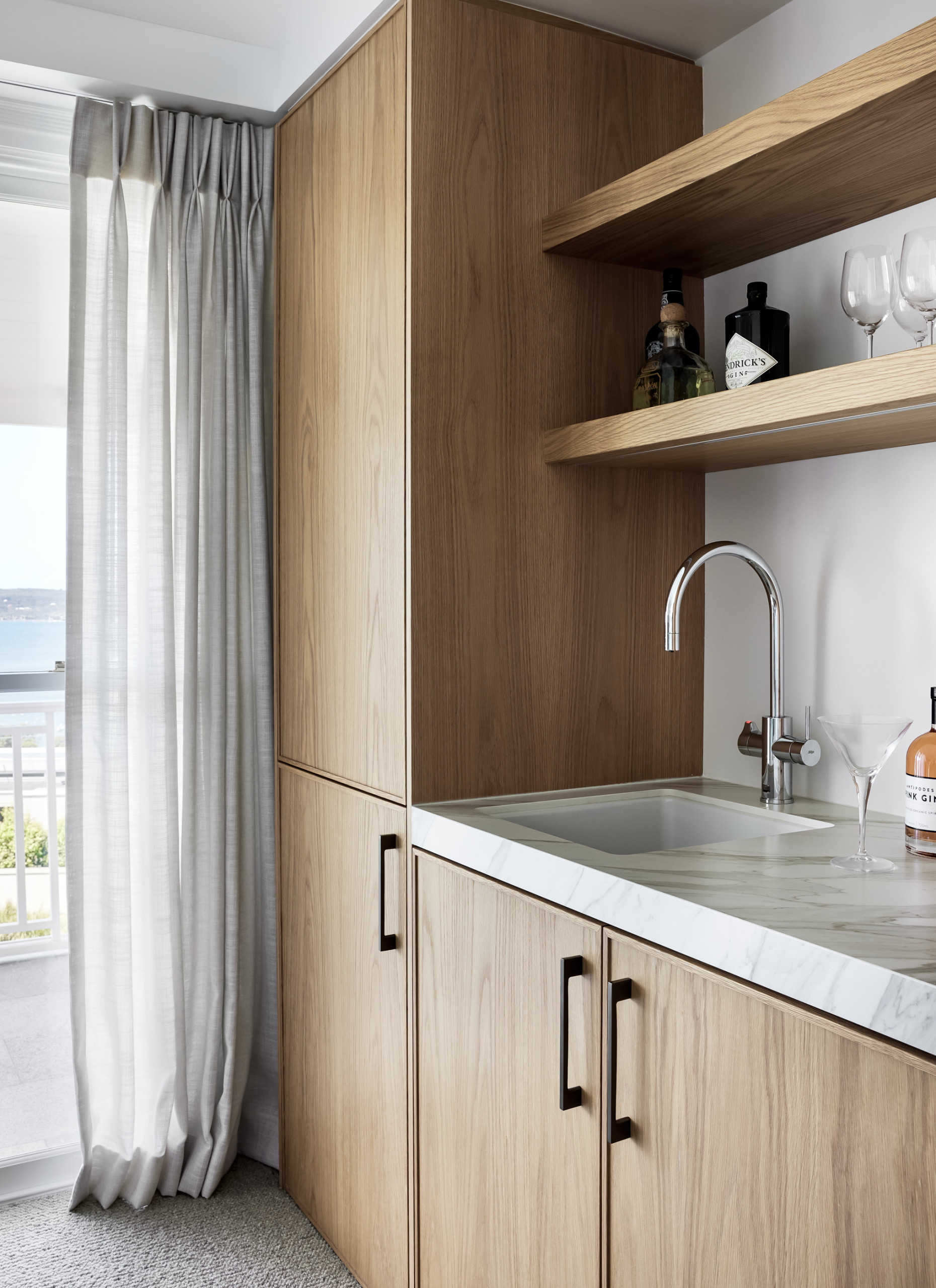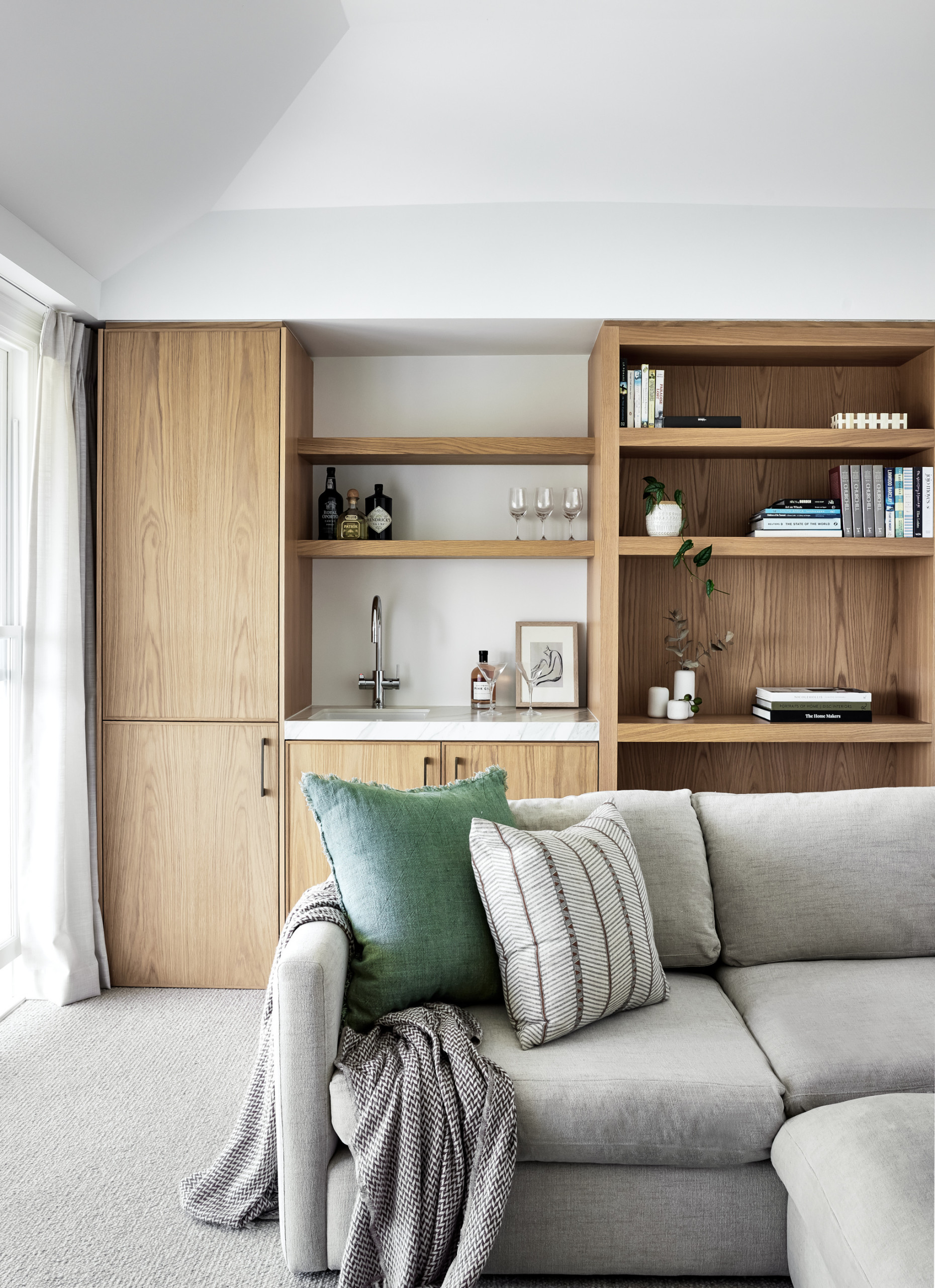 Lori designed a stunning new kitchen in warm, custom-stained oak with a marble-look ultracompact worktop, and increased the footprint of the space by bringing it forward into the living area. The additional square meterage allowed her to neatly conceal a new butler’s pantry and laundry behind the cooking space.