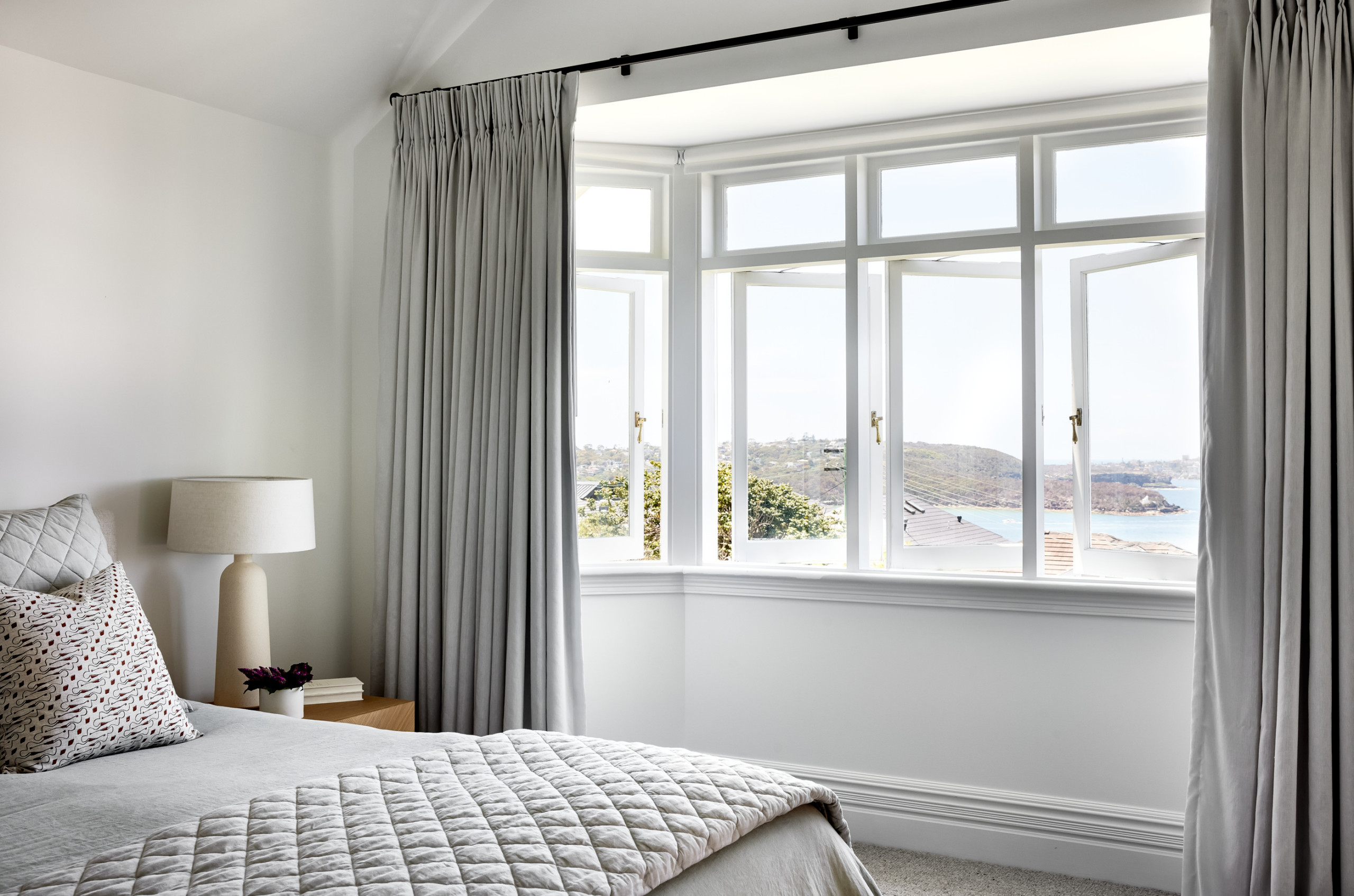 The owners wanted their bedroom to be a soothing sanctuary that made the most of those stunning water views. To achieve this, Lori chose furnishings, lighting, window coverings and bed linen in pale grey and gentle, oceanic blue.