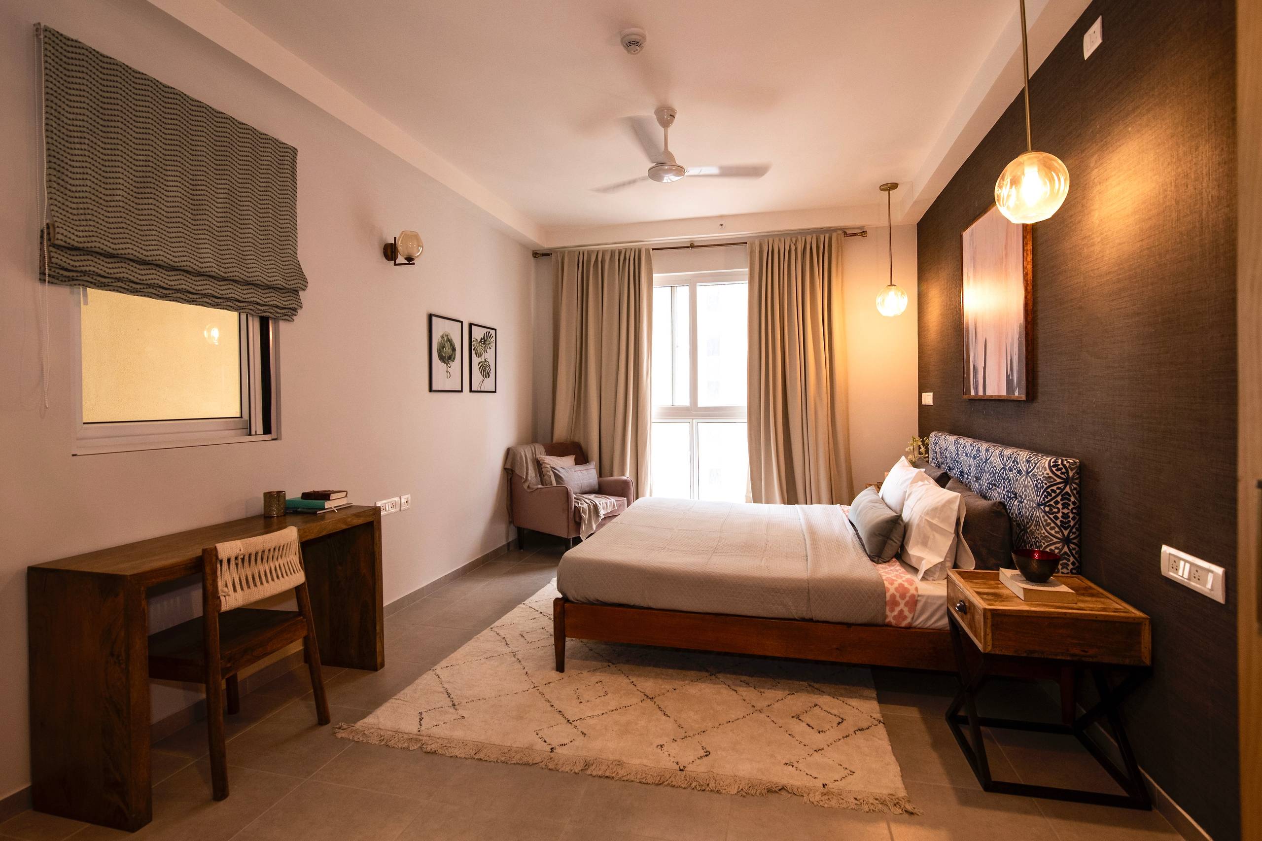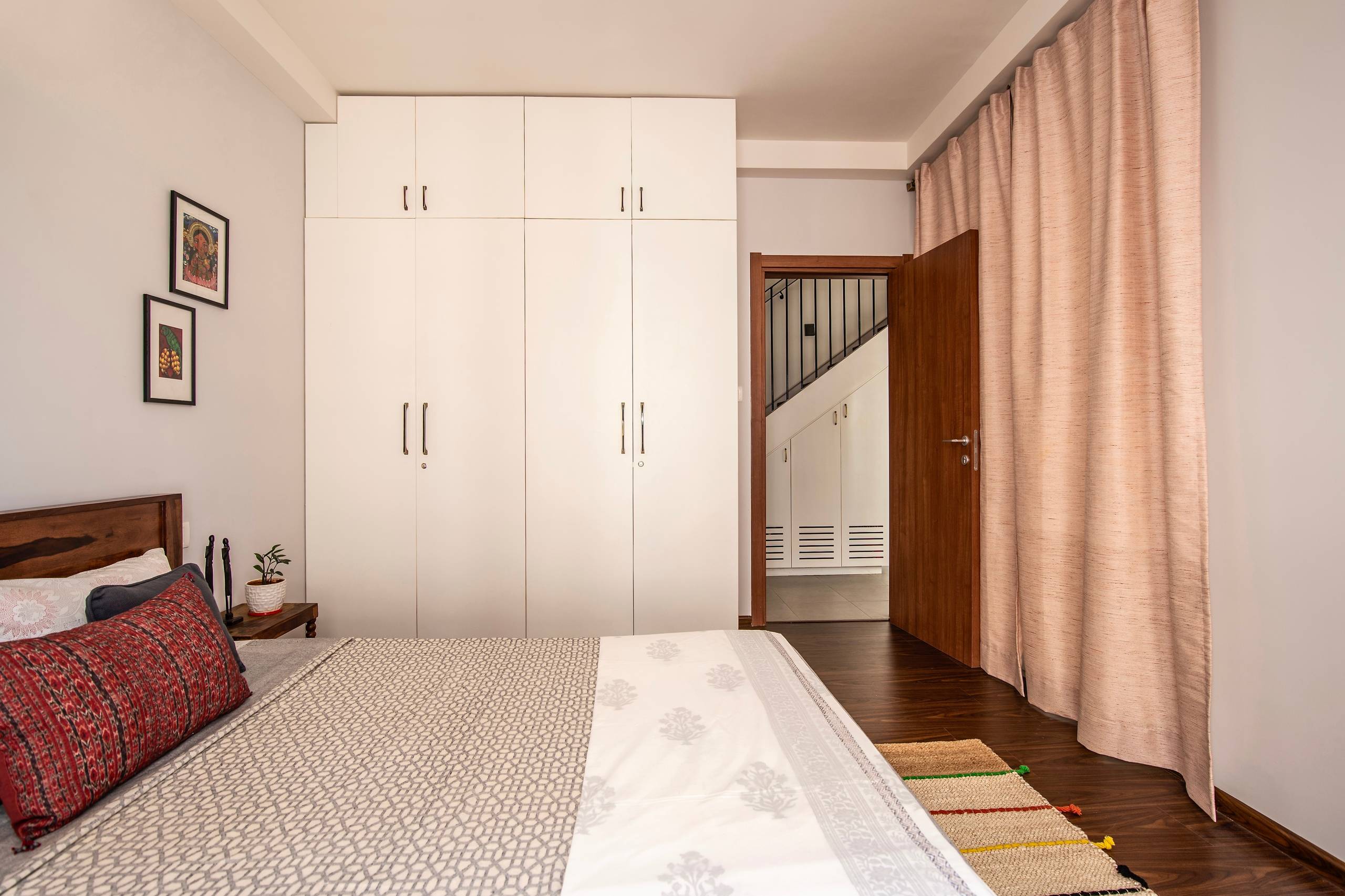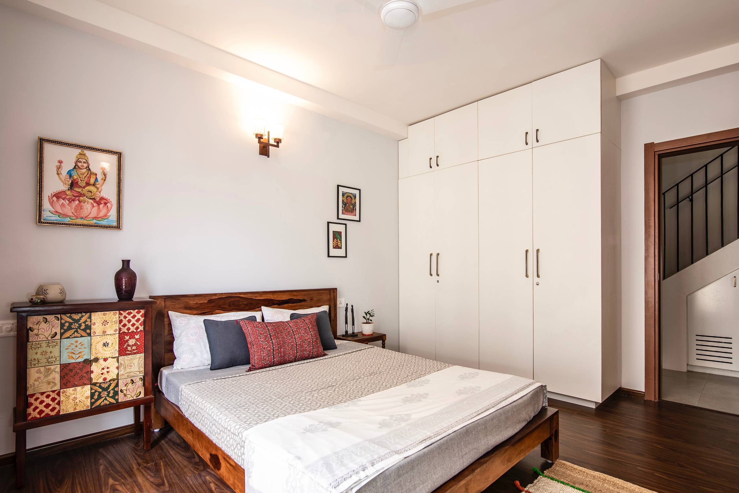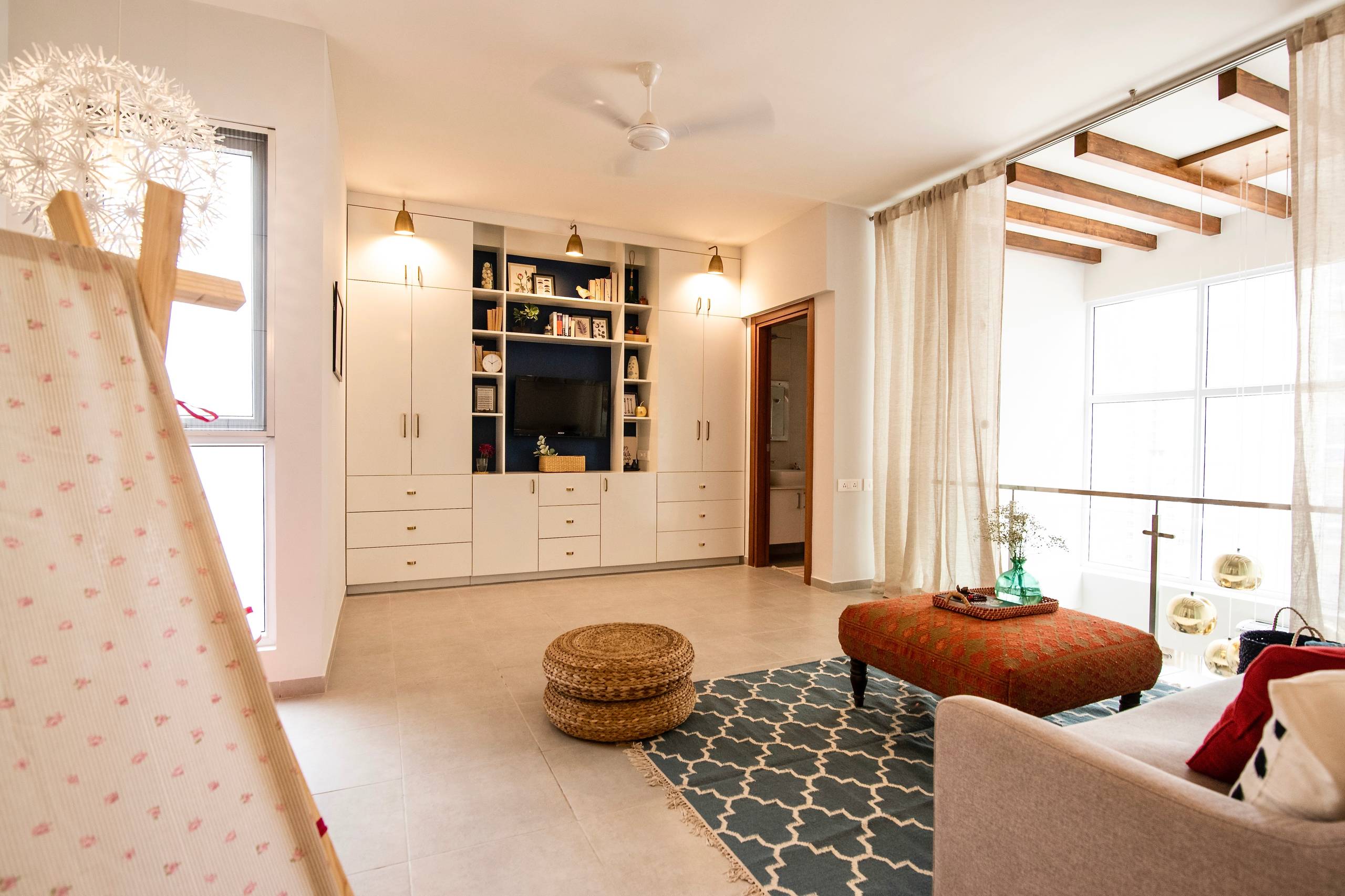 “The rest of the space is open and houses a modern white wardrobe that stands out against the warm wood. The wall lights are a modern take on the Indian jali or Moroccan lattice patterns, letting light to come through when lit,” she says.