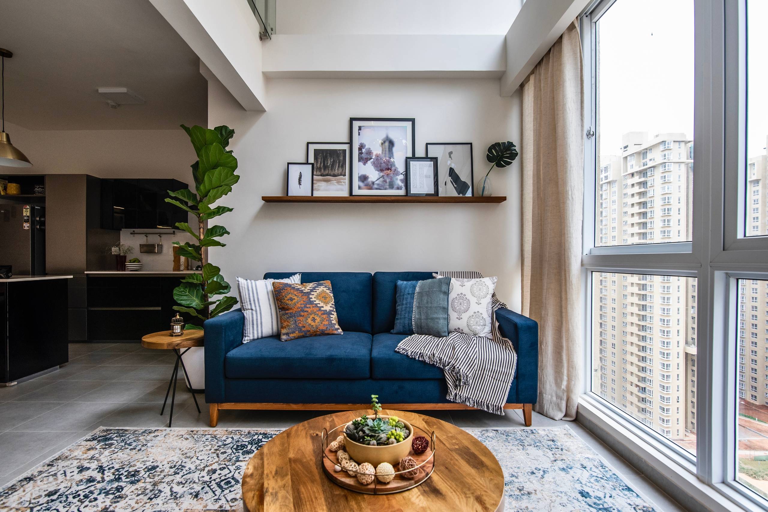 The double-height living room opens up views to the outdoors, and helps ample sunlight stream into the room. “The custom-made furniture is modern and clean-lined,” Vinithra says. “The navy-blue sofa packs a punch in spite of being compact. The custom armchairs are sleek, with bentwood arms upholstered in pale grey linen.