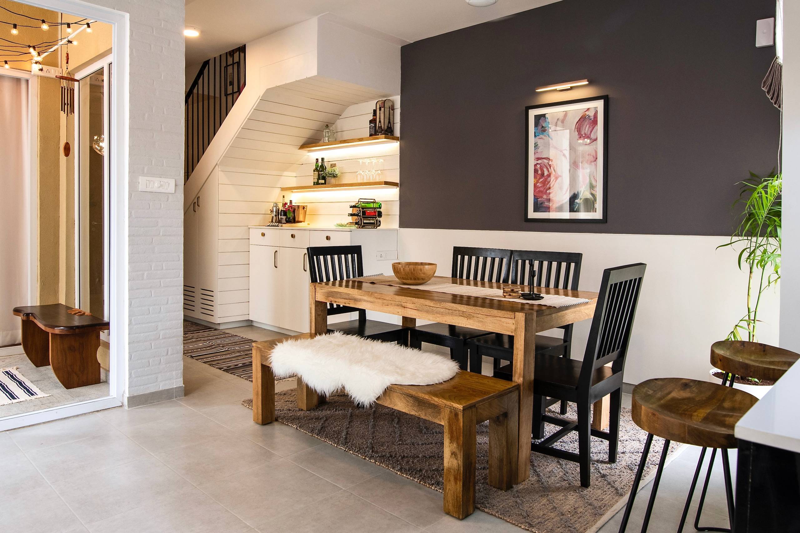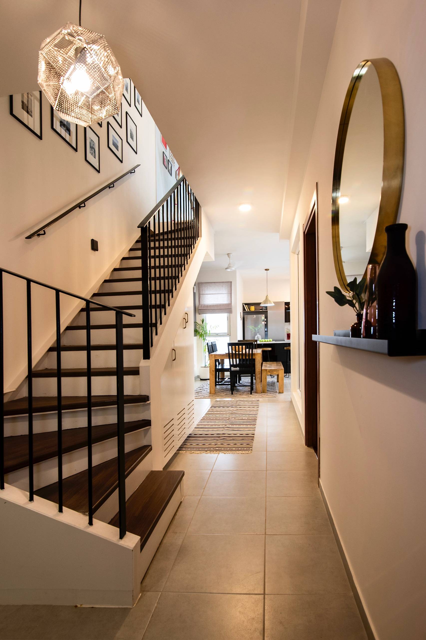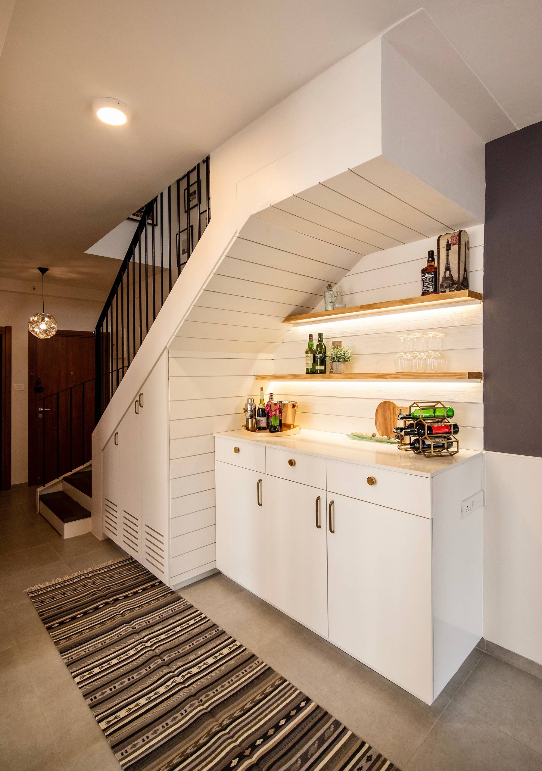 Past the entrance, the empty space under the staircase has been converted into a bar area. The white cabinets merge into the walls, saving the unit from looking bulky.