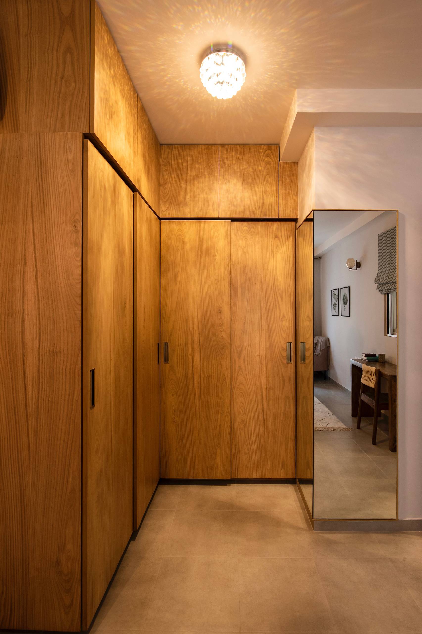 The corner wardrobes are made in chestnut veneer. “This was a challenging and tight spot to design. The leftover space was too narrow and I thought a wraparound corner mirror would be a great way to maximise the space,” Vinithra says.