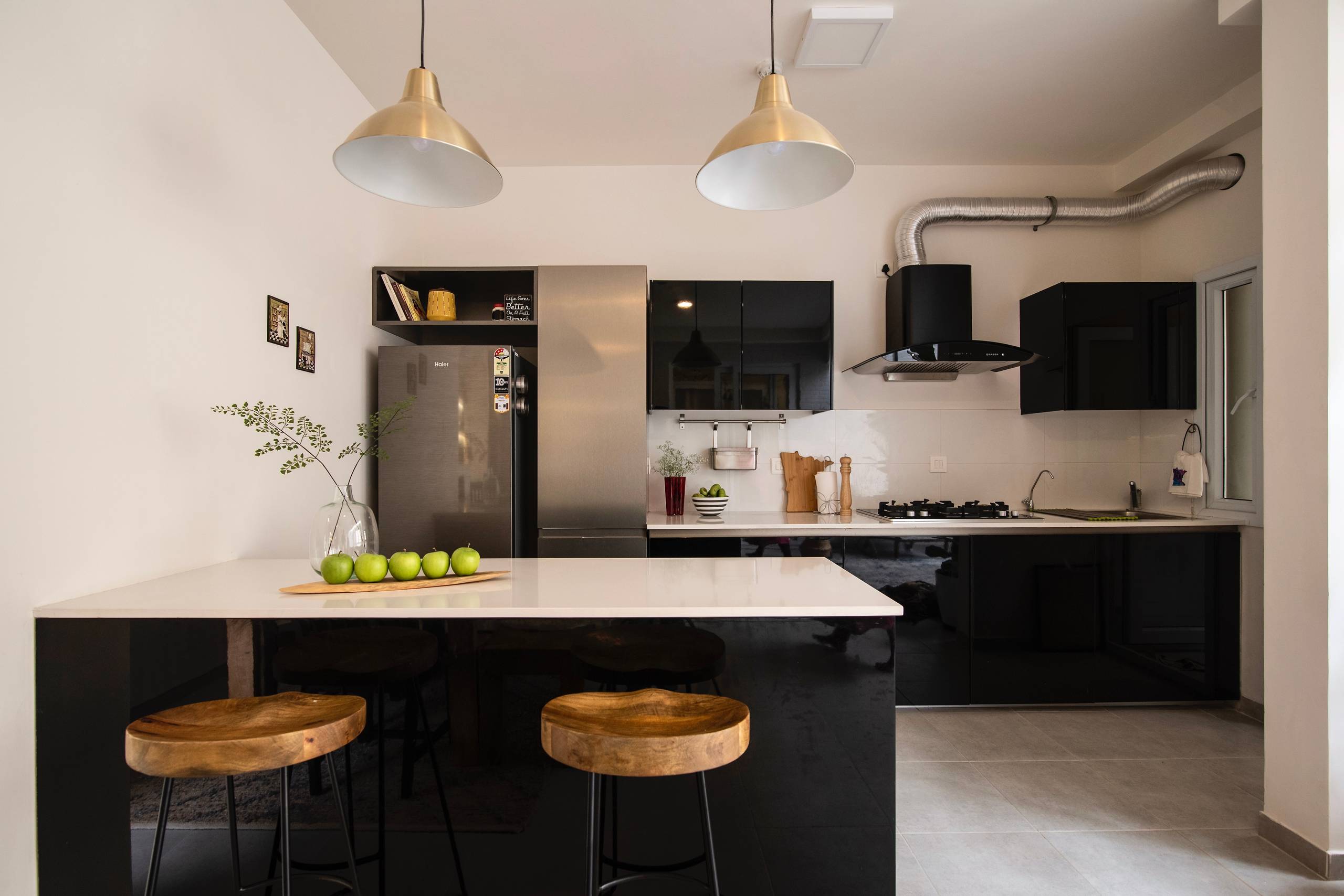 The kitchen is a sleek space, enhanced with white quartz worktops and black cabinets. “We felt the place lacked storage, so we added a sleek pantry unit in steel grey and gold pendants over the island. The natural wood bar stools stand out perfectly, adding warmth to the black and white space,” Vinithra says.