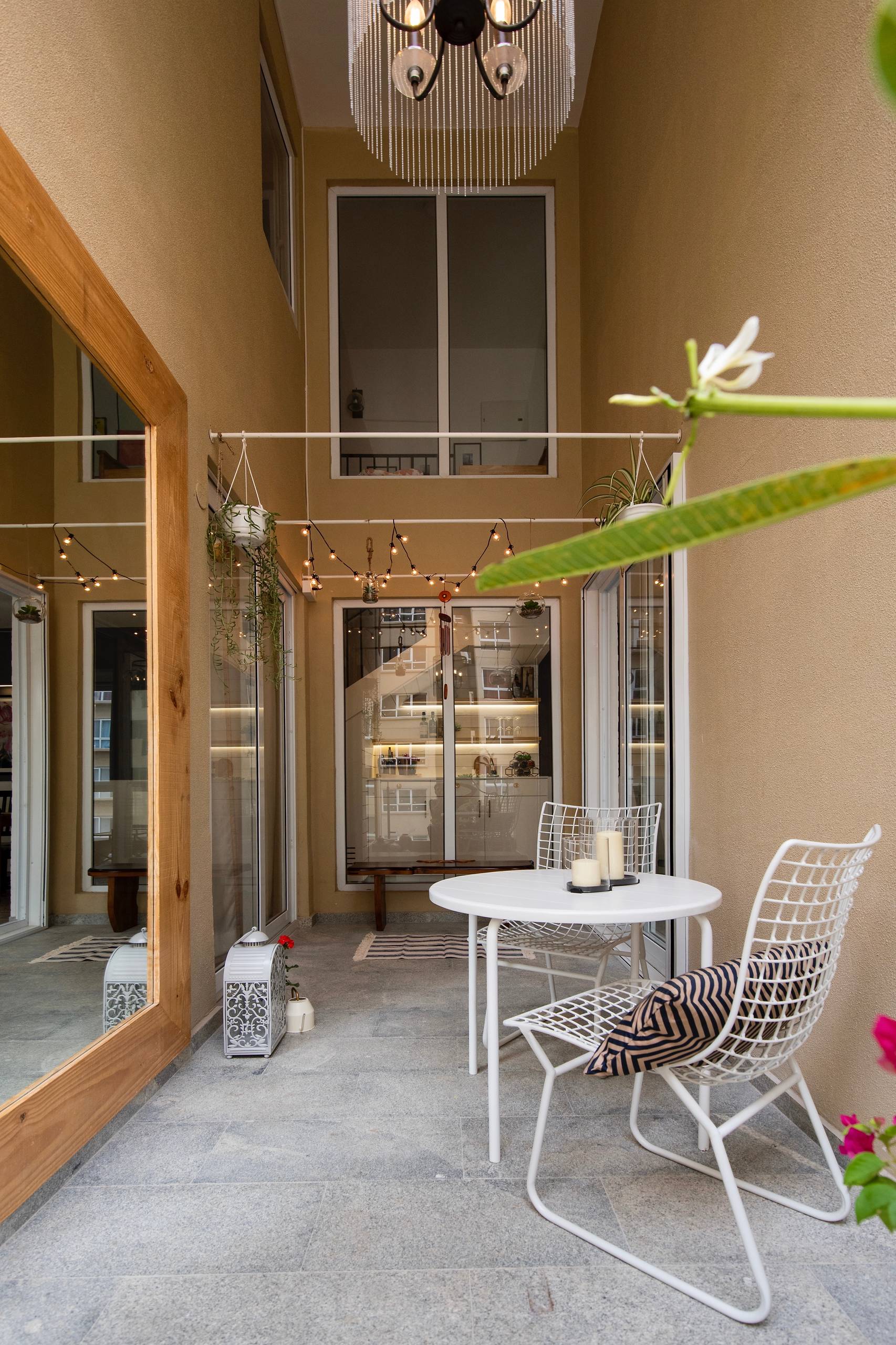The living room opens out to a small, cosy outdoor space enhanced with furniture, plants and lights. “A chandelier with hanging chains is used to amplify the double-height ceiling here,” Vinithra says.
